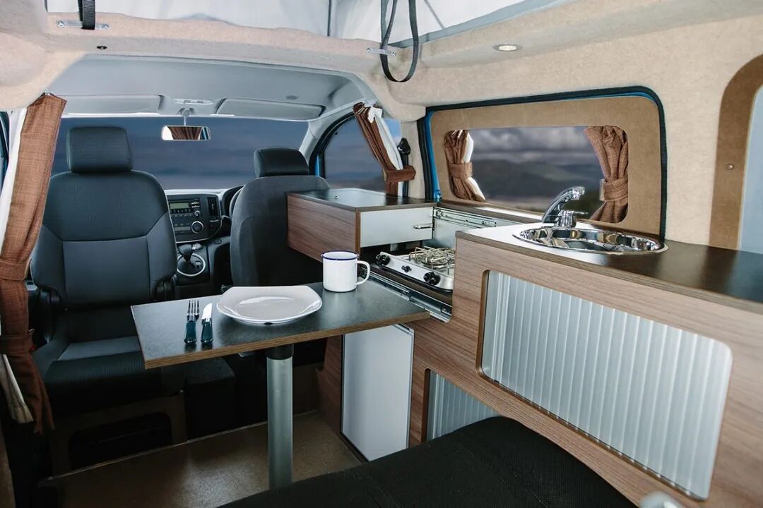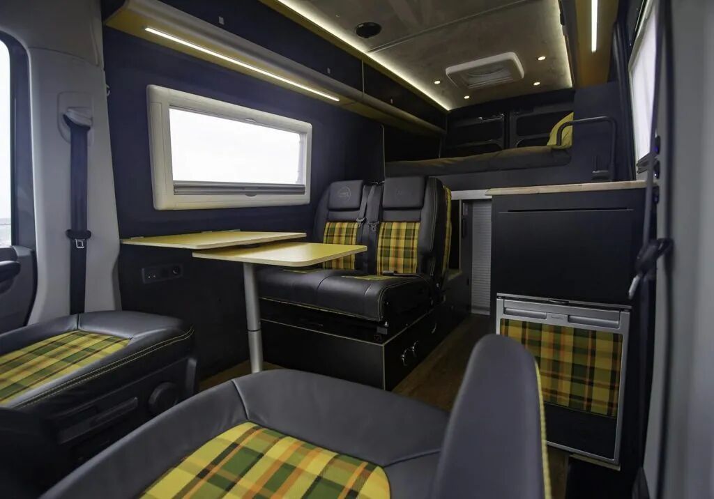 车身内部,配备有旋转座椅和可移动桌子的桌板,二者配合可以作会客区或用餐区;厨房区配备水槽、燃气灶和冰箱的等,满足做饭需求;休息区除了车顶的升降床,座椅同样可以拓展拼接成一张大床。