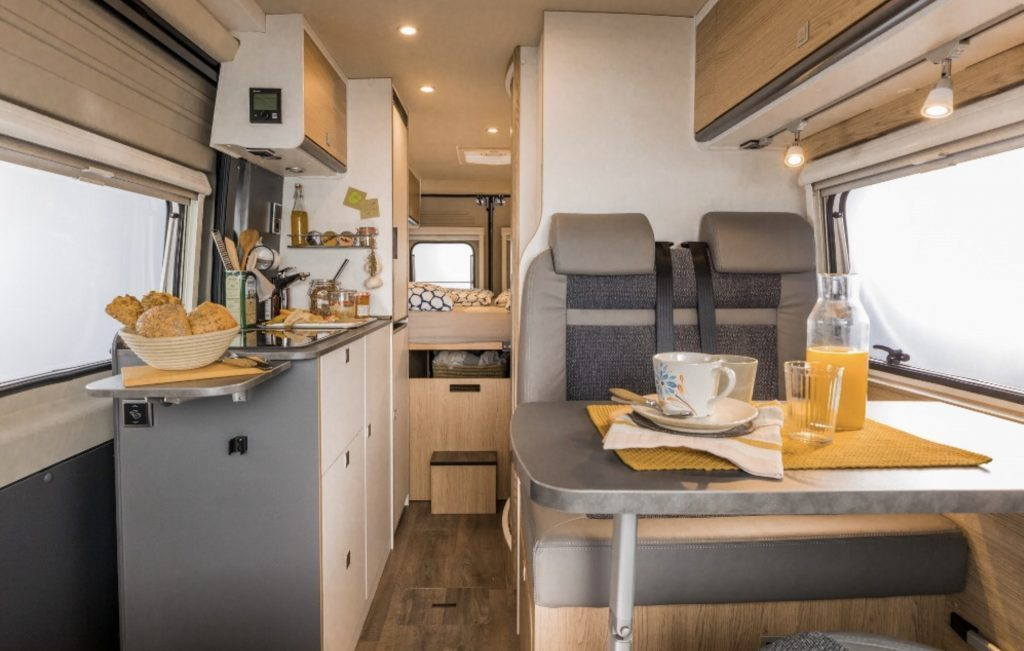 浴室之外是一个开放式的小厨房,配备有拓展桌板,做饭操作很便利。带旋转座椅的用餐区可容纳四个人。车内尾部区域是一张双人床,两名成年人睡卧也舒适不拥挤。