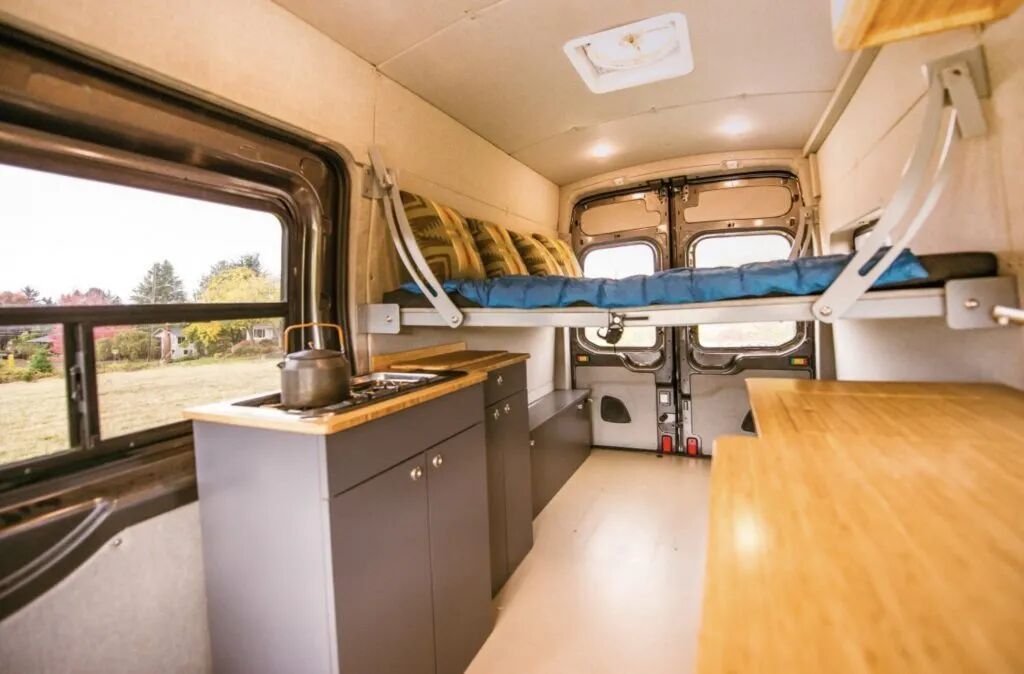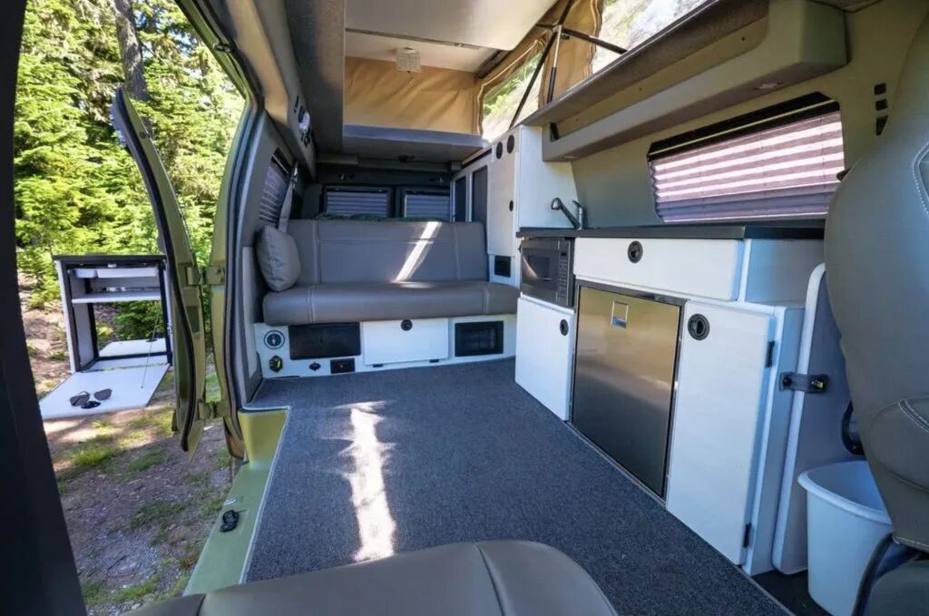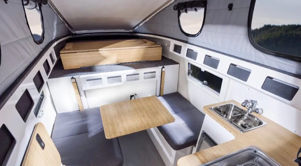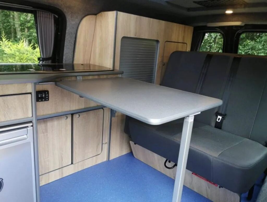 厨房部分设有一个带水槽、两个燃烧器的炉灶、冰箱、储藏室等。旋转座椅和可移动桌子创造了一个用餐区,更多的存储空间沿着墙壁布置,用于存放衣服和其它生活必需品。 如果想在周末外出或在满足这些条件的短暂出行,这款车还是很适合的。
