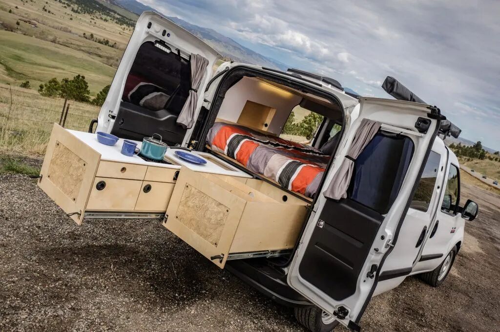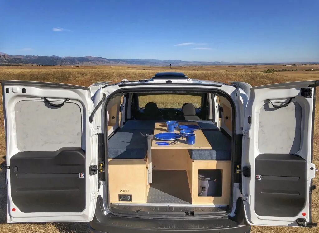 Ram Promaster City房车有两种基本布局选择。第一种选择是一张大双人床布局,床将占据了整个面包车,看起来比较像床车。实用方面可能差一些,除非在非休息时间你能一直坐在车外。但好处是这种布局带有一个很棒的抽拉式厨房,因此可以在户外做饭和用餐。
