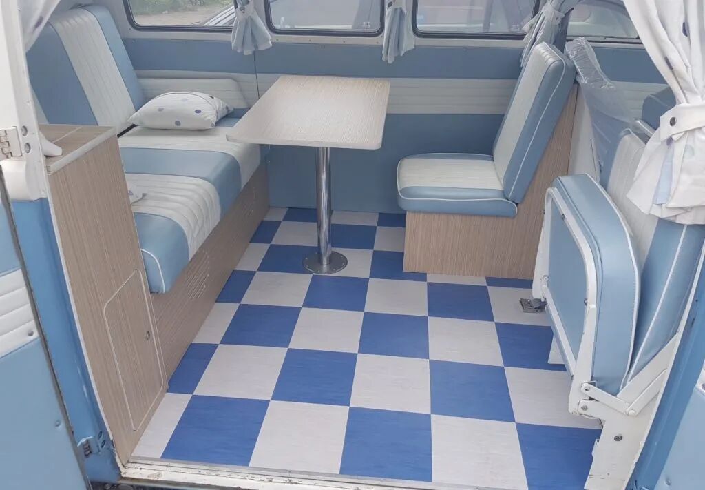 明亮、大胆的颜色是大众巴士的标志性外观,试想坐在这样一辆巴士房车上感觉会不会很爽?大众巴士的内部看起来和五颜六色的外观一样可爱,颇具童话梦幻风格。引人注目的棋盘格地板是真正复古大众巴士的必备品,醒目的皮革内饰也是如此,与露营车的外部颜色和谐统一。