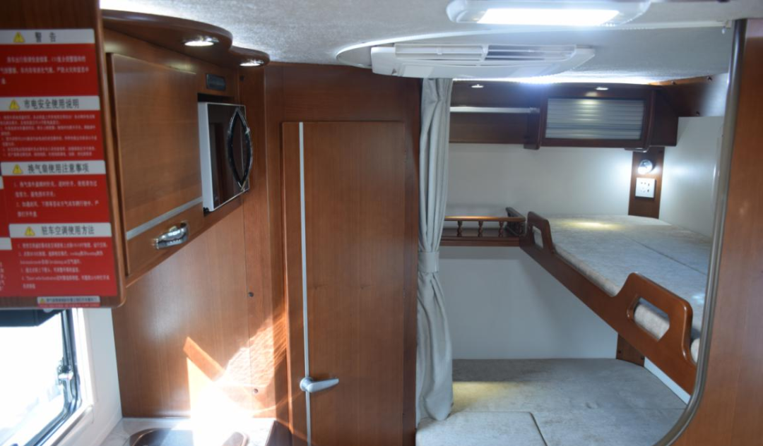 ● 额头床可睡两人,顶部设有天窗,两边有侧窗可采光通风,床板可向上翻起,内部嵌入了一台32寸智能车载电视;