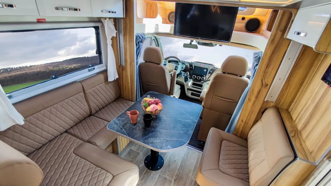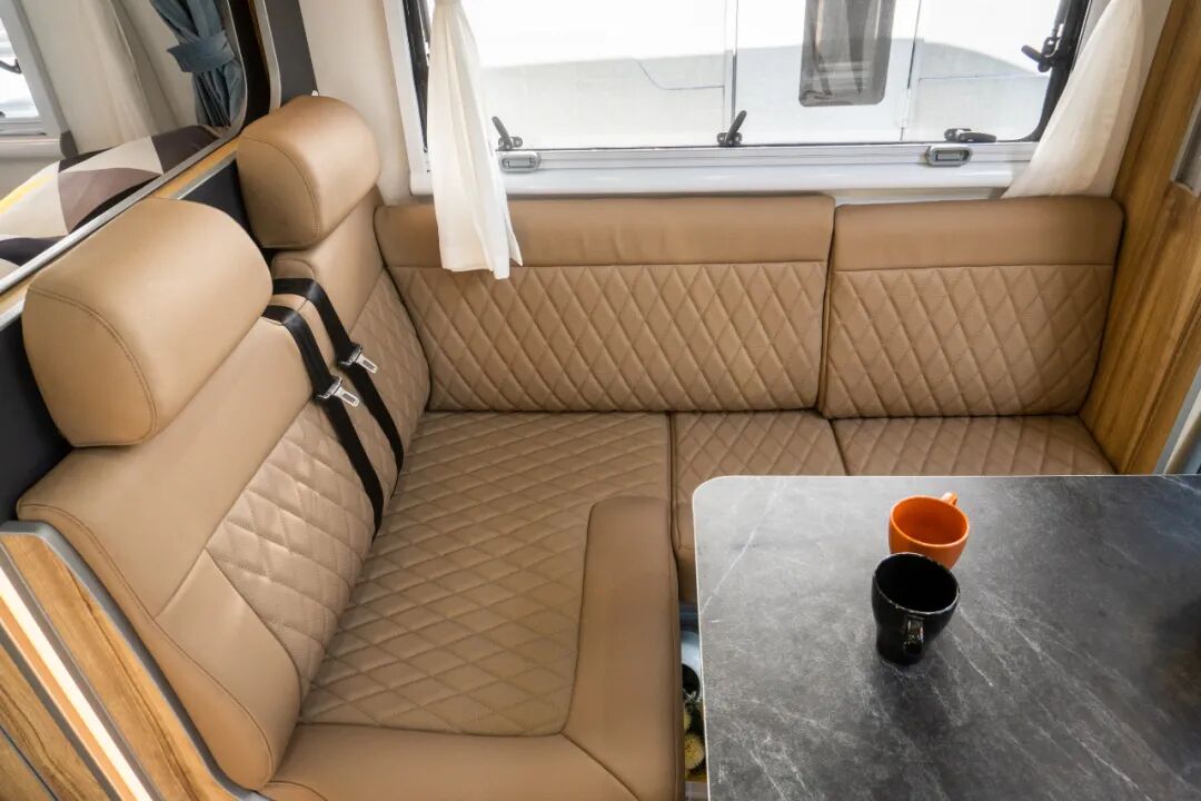 生活区与驾驶舱贯通式的设计方便日常进出;而在驾驶舱正后方便是会客区的位置,采用L型沙发卡座+独立座椅的设计,可容纳4-5人;中间设有升降式(四向滑移)餐桌可供日常餐饮、休闲娱乐使用;