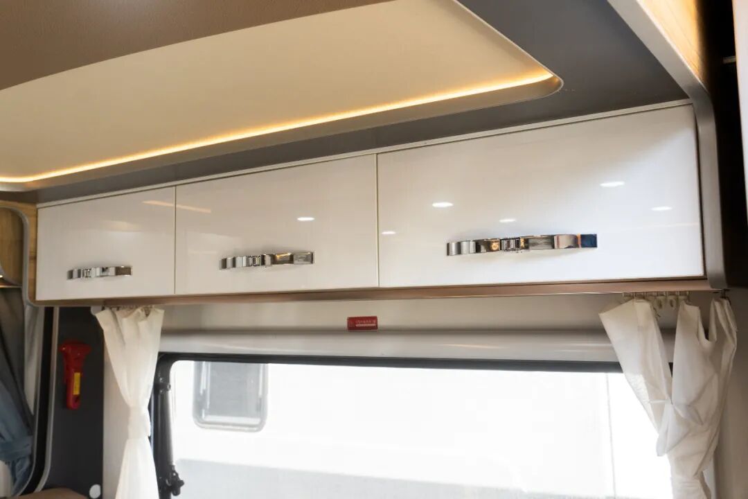会客区上方设有多组吊柜,进一步丰富储物空间;侧方则是大尺寸外推窗,日常采光、通风没有压力,驻车、行车时用于欣赏沿途风光也是惬意的享受,同时内侧设有窗帘保护车内人员隐私,私密性有保障,日常也可以用于遮光;