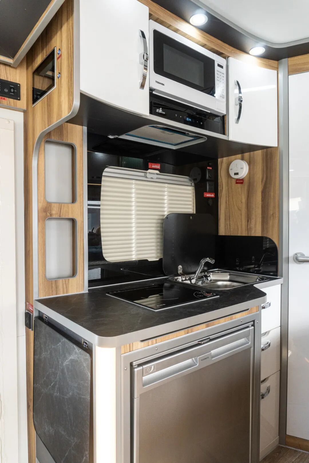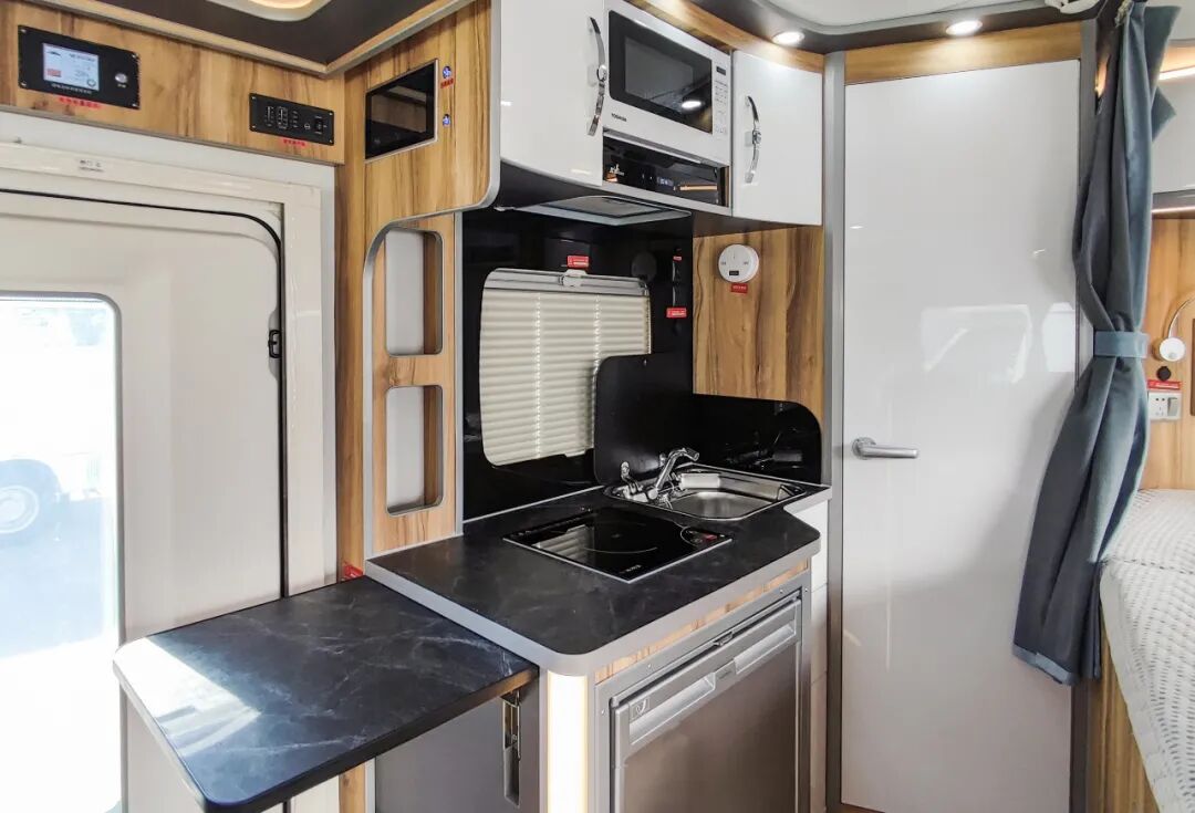 厨房区采用一体式橱柜的设计,配置了车载电磁炉、盖板式洗菜池、折叠式水龙头、电源插座、外推窗、防溅挡板、多美达110L车载冰箱、储物抽屉等;