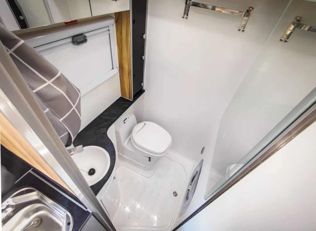 一体式卫浴区内部的空间还是很充足的,同时配备了赛特福德抽拉盒式马桶、洗漱池、水龙头、独立淋浴花洒、带浴镜的储物柜、化妆镜、毛巾架、浴帘、外推窗、换气扇、进口迷你洗衣机等设施,充分满足车上人员的卫浴洗漱需求;