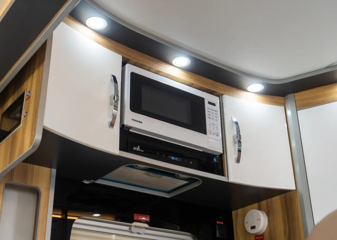 顶部装载房车专用抽油烟机、微波炉、储物吊柜等设施,满足车内独立烹饪的需求,同时也可配合户外厨房使用;
