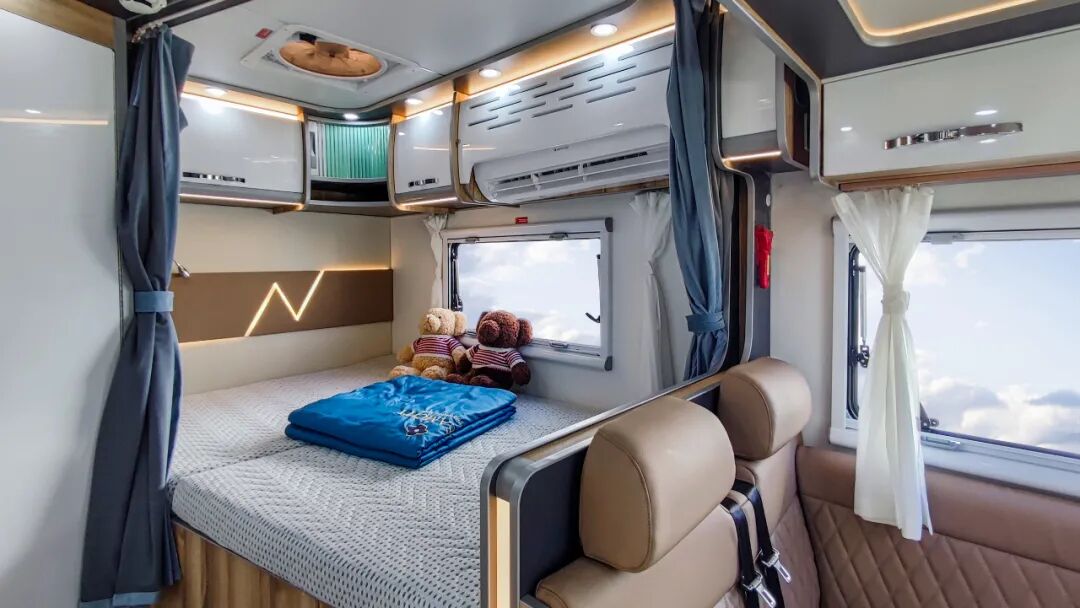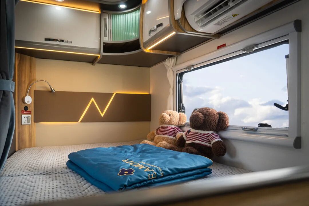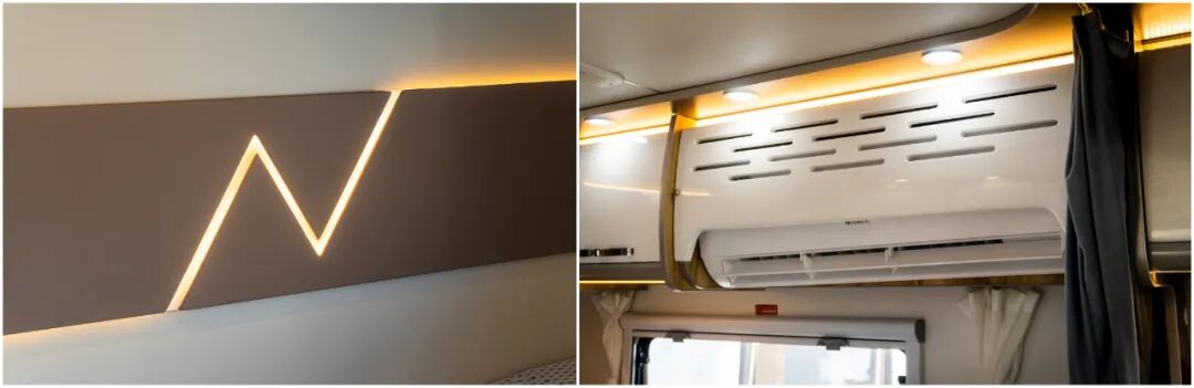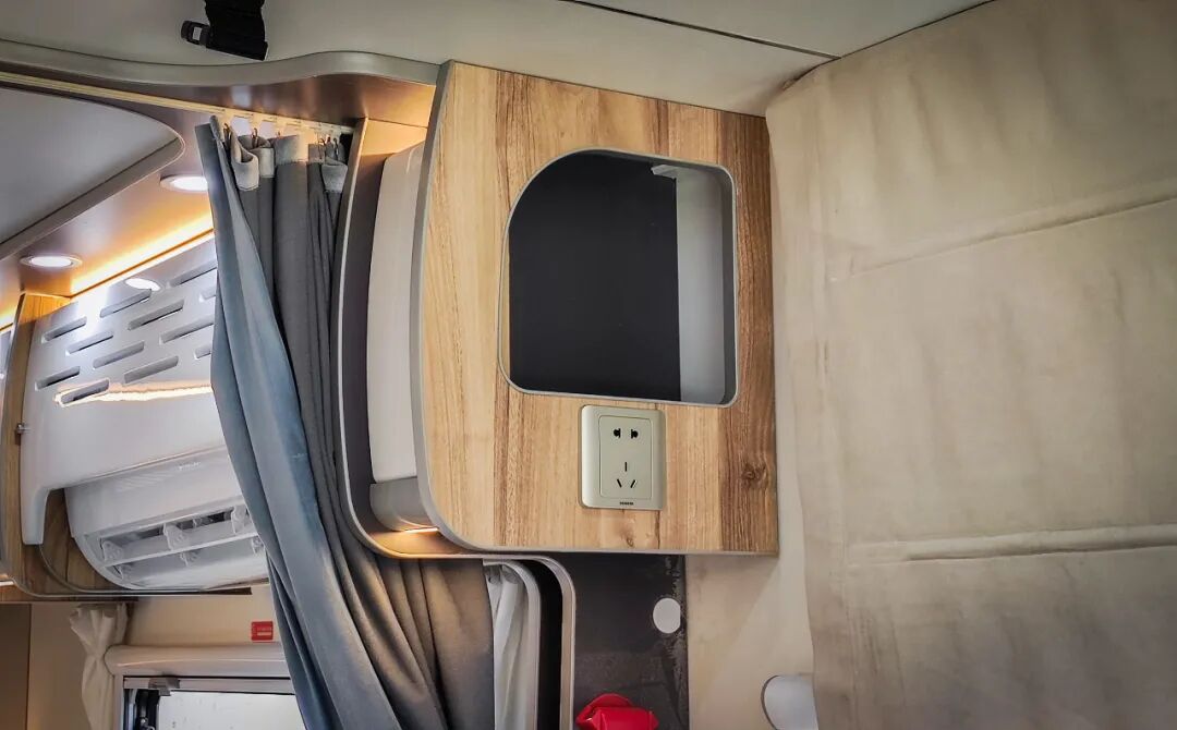 双人床侧方设有大尺寸外推窗加强车内空气循环,采光效果也得到一定提升,同时配有窗帘保护个人隐私;顶部搭载多组储物吊柜,储存空间丰富;此外,休息区侧上方还配备了家用空调;尾部设有阅读灯、开关、电源插座方便休息时使用;