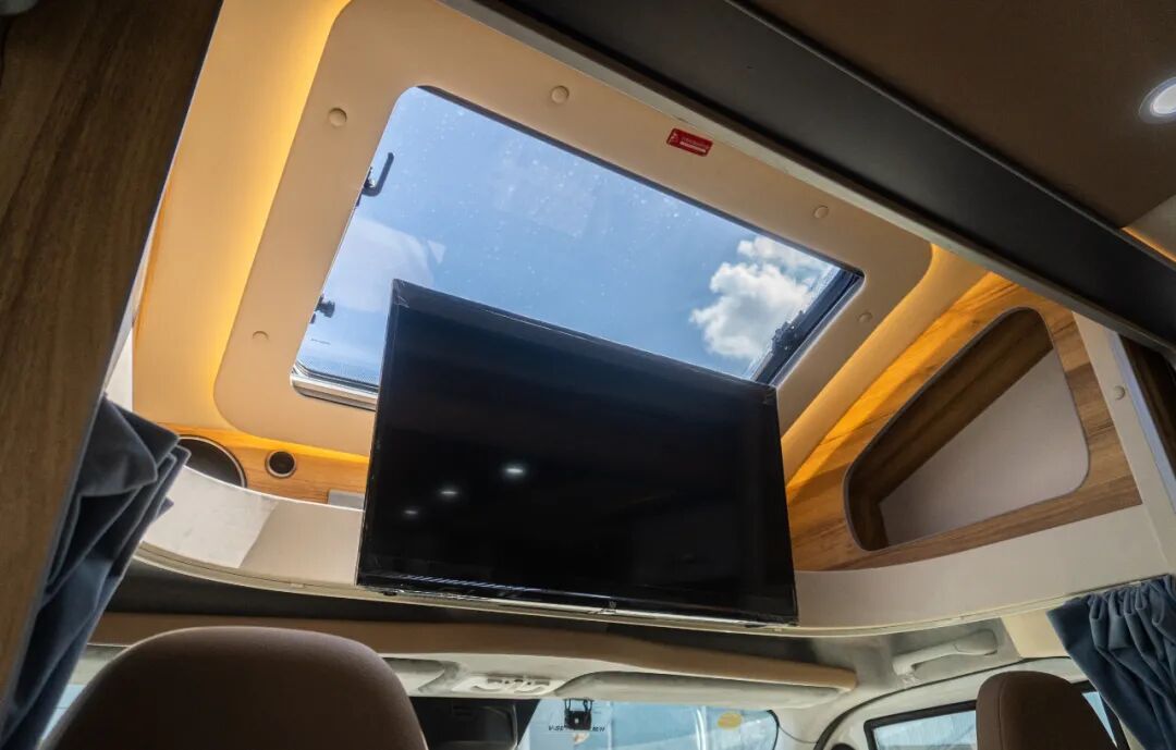会客区前方小额头的位置设有顶置天窗,加强车内采光与空气循环;天窗下方则是一台32寸网络智能电视,搭配生活区高低音组合音响系统可为你的旅行生活提供良好的影音娱乐体验;额头两侧分别设有置物格方便放置一些小件儿物品;