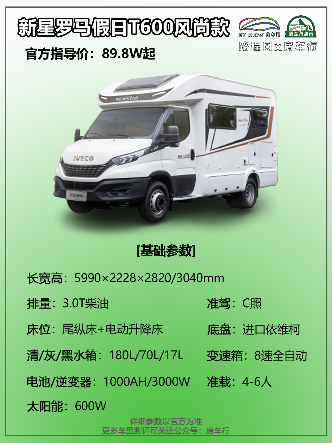 新星罗马假日T600风尚款房车的外部尺寸为5990x2228x2820/3040mm(根据选配有所变动),核载4-6人,上蓝牌,C照可驾驶;外形上采用T型车经典小额头的设计,流线型的轮廓有效降低风阻系数,减轻行车油耗,同时不到三米的车高也赋予它良好的通过性能,适用场景广泛;车头点阵式格栅,鹰眼式额头灯,车身外漆面选用白色打底,并辅以黑色、棕金色拉花,整体看起来典雅高贵又不失锐利;