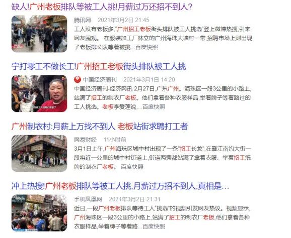 广州出现逆向招工潮。“广州招工老板街头排队被工人挑”一则新闻也被推上热搜。据悉,广州不少制衣厂面临“招工难”,一名工厂老板称,厂里最多曾有百名工人,现在不到三十人,曾因人手不够延误货期。并且,在谈到年轻人的“就业观”时,直言90后“创业心较大”,“三点一线”难留人。