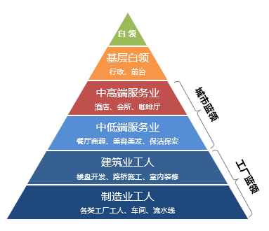 参考张子陶的《白领招聘已饱和,蓝领招聘还空着呢》文章中描述:蓝领群体可以划分为工厂蓝领、城市蓝领以及基础白领三类。其中工厂蓝领可以进一步分为制造业蓝领和建筑业蓝领,城市蓝领可以进一步分为中低端(如超市、保洁等)与中高端(如酒店、咖啡厅等)蓝领。这两部分人群数量可以占到总蓝领群体的 90%。