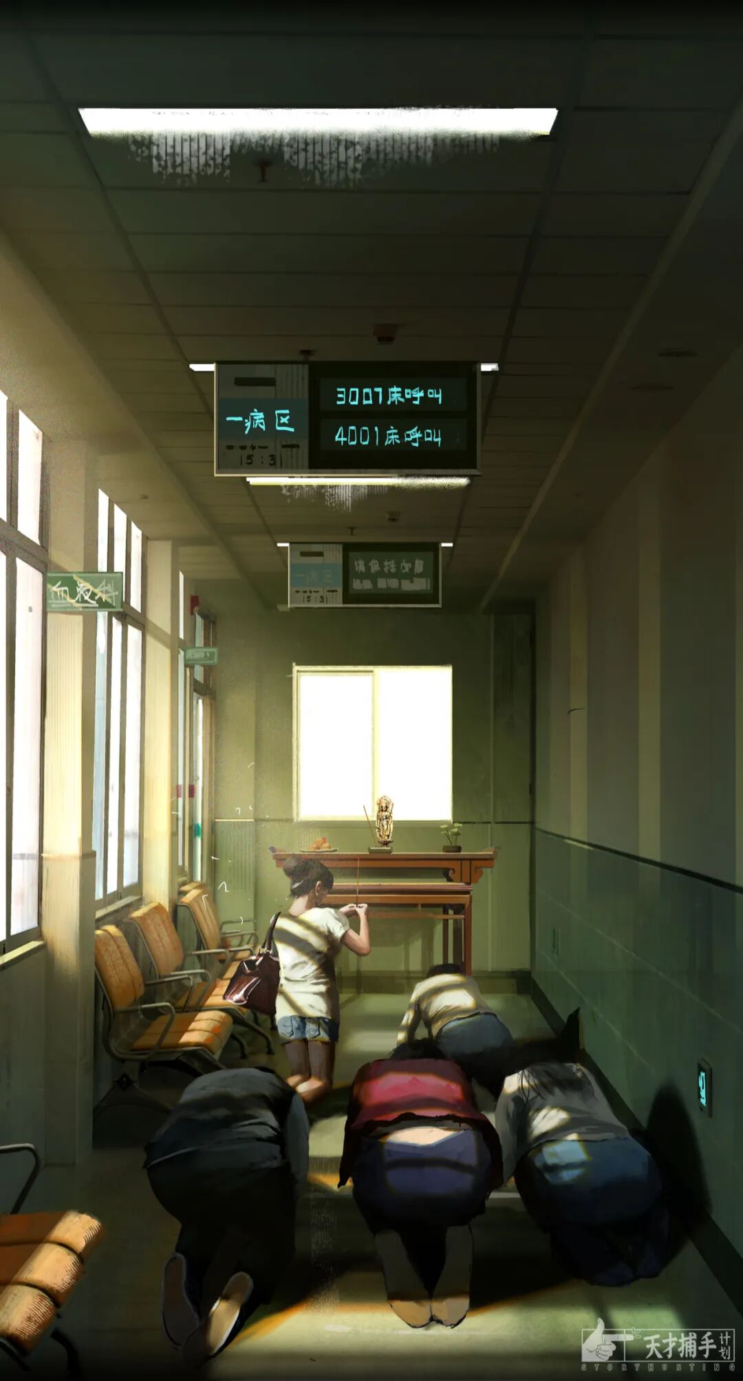 当时几乎全家族出动,朋朋的七大姑八大姨全都守着。朋朋妈这时拿出一个三十多厘米的观音菩萨像,摆到了走廊尽头,然后带领十几个家族女眷集体拜起了菩萨,嘴里念叨着保佑儿子平安。她们身后,十几个男家属正帮着推床推呼吸机。