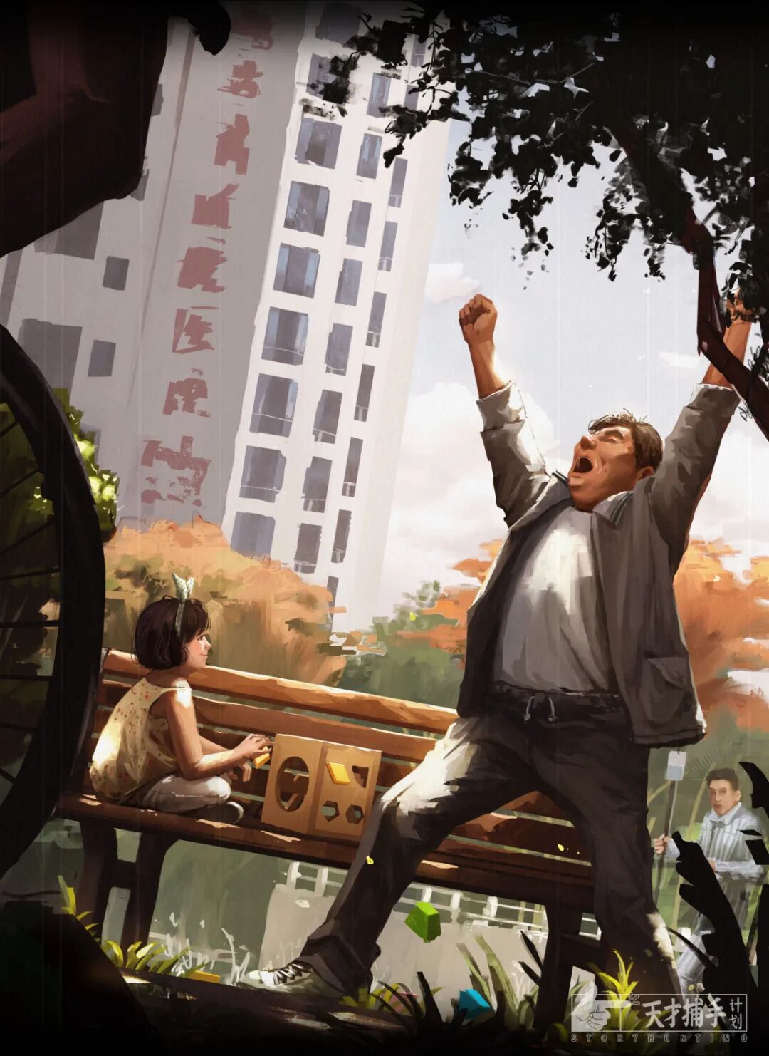 有一次,静红一手牵一个来到医院复查,等待结果时,老于就和女儿在医院的小花园里玩耍。他们拿着那种小朋友认形状的玩具,把圆形、三角形、心形的各种积木放进对应的模版里。