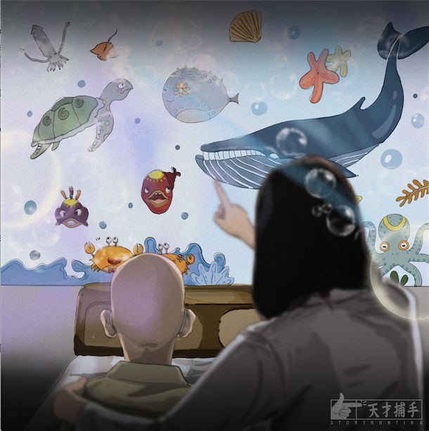 偶尔有时间,我就会陪圆圆,指着病房墙壁上的画儿给她讲海底故事。