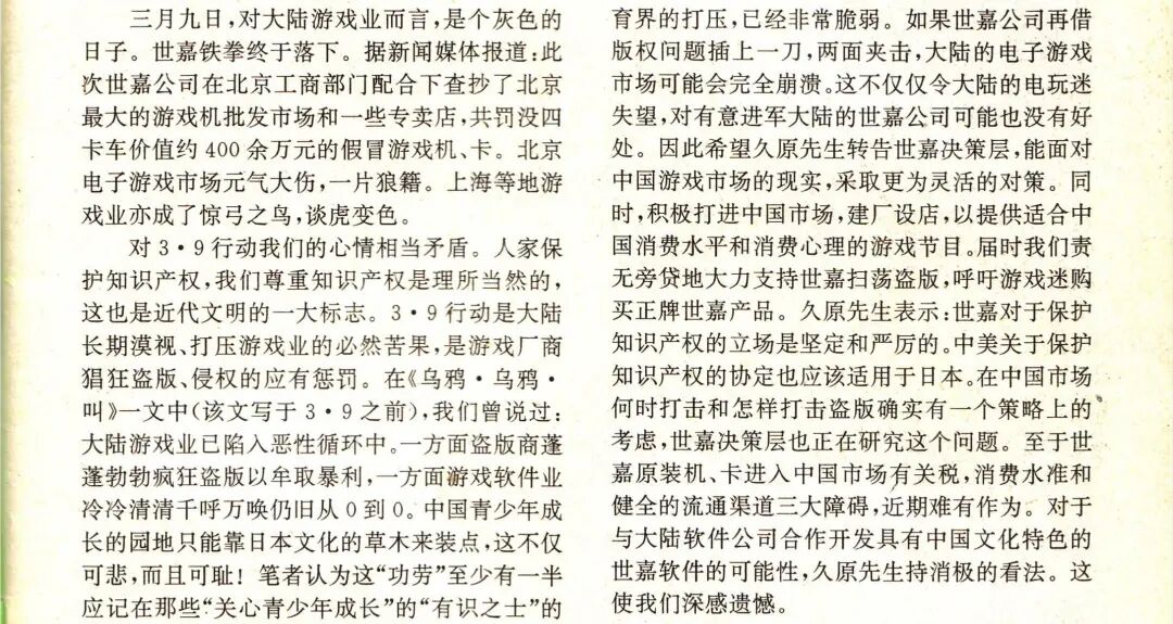《电子游戏软件》这篇文中也介绍到了,在3.9行动之后杂志方曾经专门与世嘉公司驻中国代表“世嘉华瀚文化娱乐有限公司”的总经理久原实先生,进行了坦率而友好的交谈。