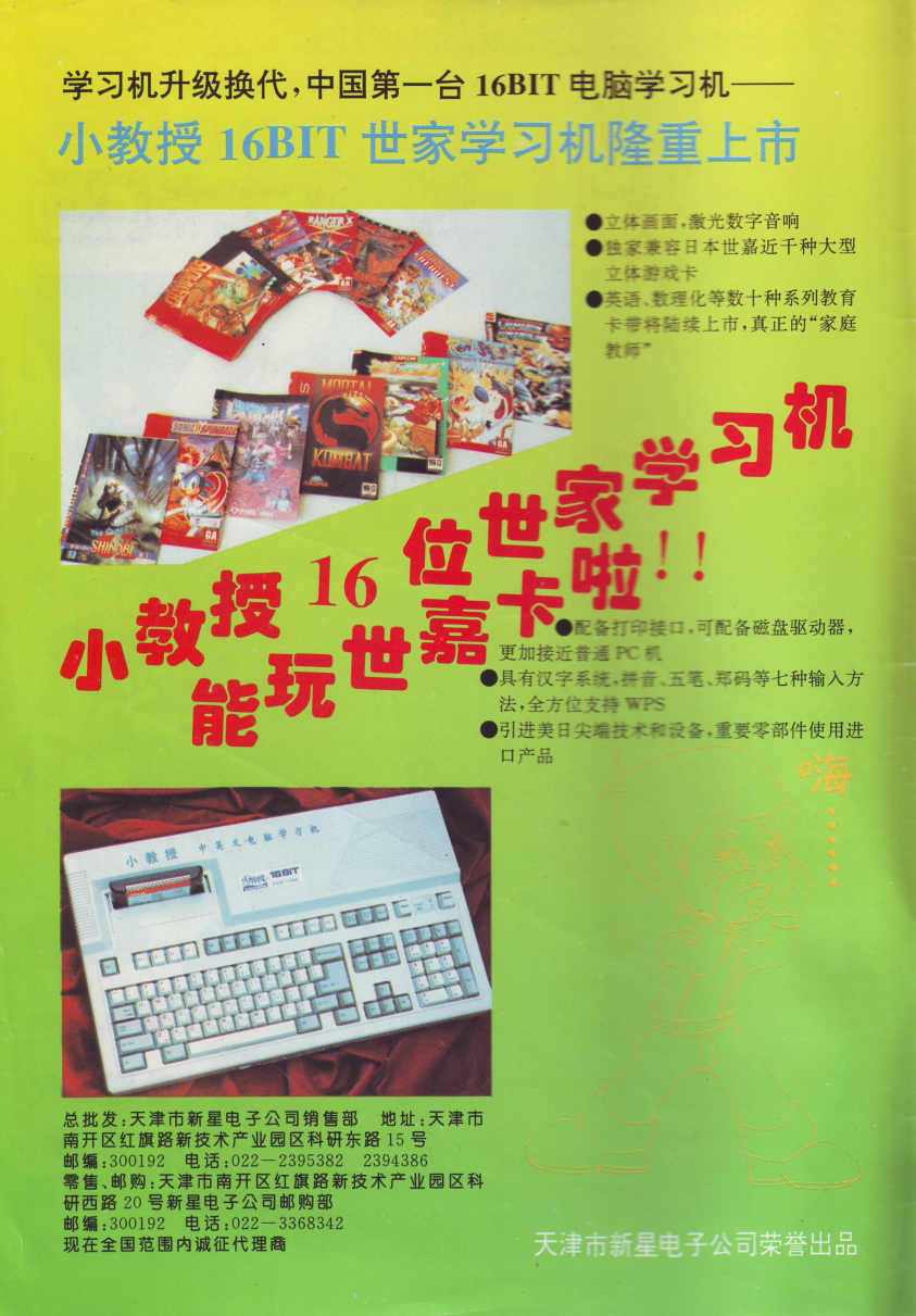 95年5月第十期,也就是世嘉查封盗版的两个月之后。《电子游戏软件》就刊登了小教授16bit世家学习机的广告。(这是盗版游戏机,世家这两个字可没有打错哦!这一招玩得还真绝啊!)