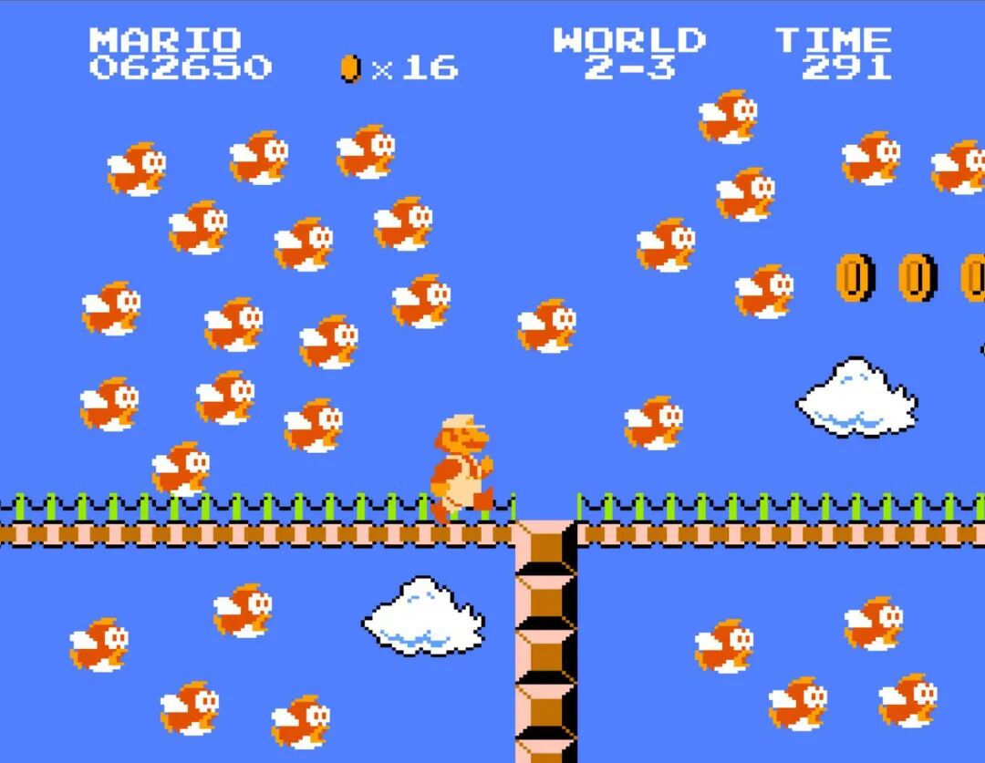 游戏中的场景一般分为:地面、水下、地下、天空、城堡,每一个场景的氛围都是不同的,最让人心旷神怡的自然是天空,在天空一般都是有搞头的、而最让玩家恐惧的就是水下关和飞鱼关。