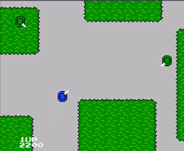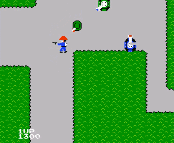 BOSS就是一个坦克,打爆之后就会出现一个小兵举着白色的旗子出现,表示投降。比较奇怪的是,游戏过关之后,分数不变,但是场景却又恢复到了最开始的地方,场景稍微发生了一点点变化,敌人的射速加快。