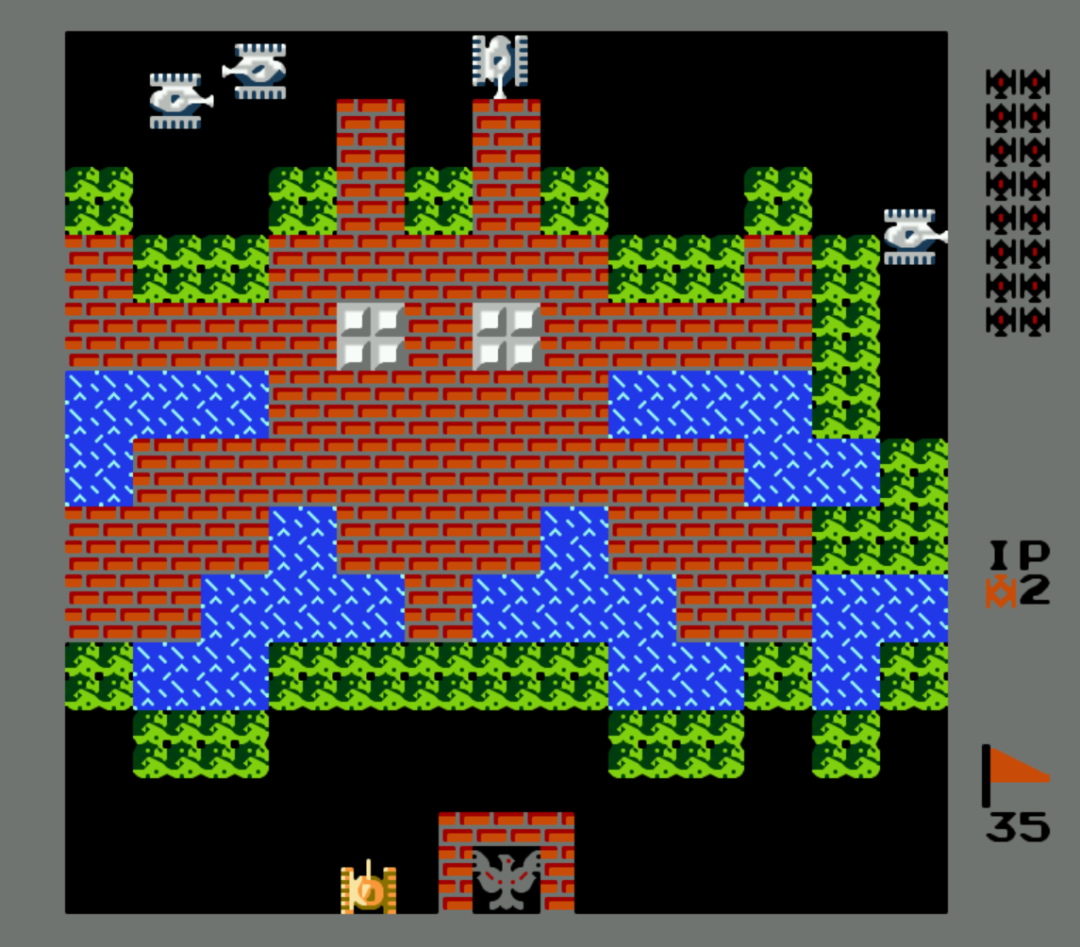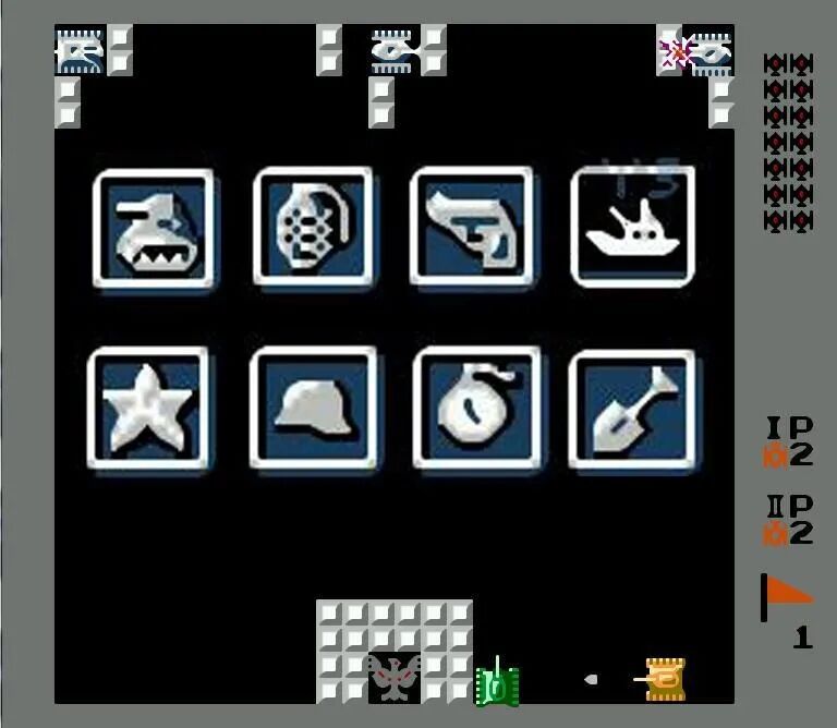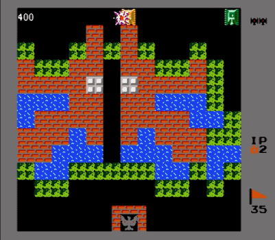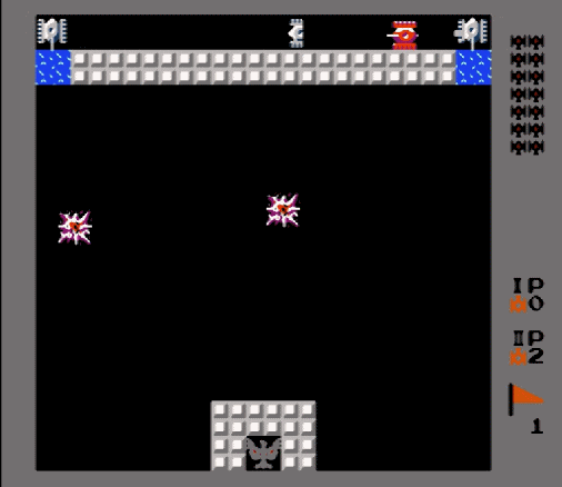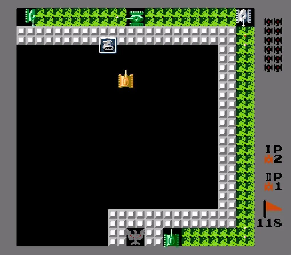 其实,玩家们用得最多的场景就是将2P玩家给困住(如下图),只要敌人打不到这方基地就万无一失了。而2P只能默默注视着1P将敌方消灭干净了,将所有的道具收入囊中,而自己什么办法都没有。
