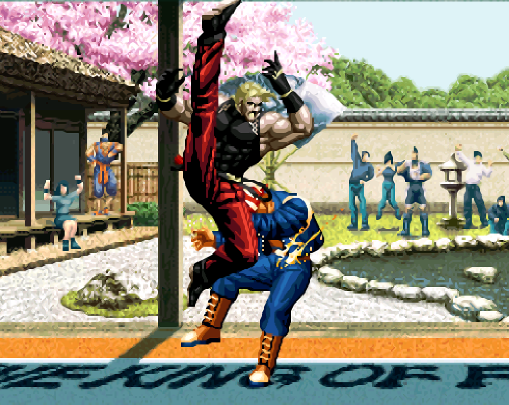 不过这款游戏中隐藏的援助非常之多,调试这些人物才是游戏的乐趣之一。这是SNK在破产之前的最后一作,因此让曾经参与过SNK游戏的角色都有机会登场。也是在这个版本中我们见识到了风衣八神,而大蛇八杰集也通过援助平台再次登场。
