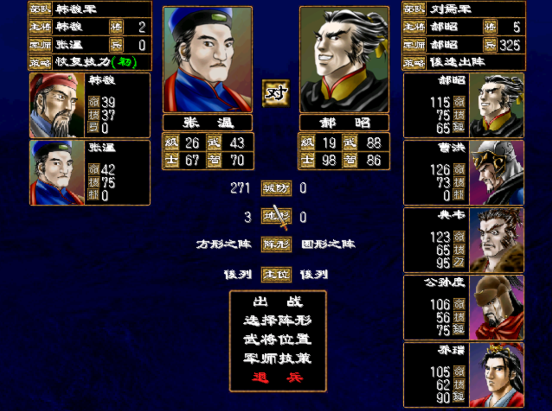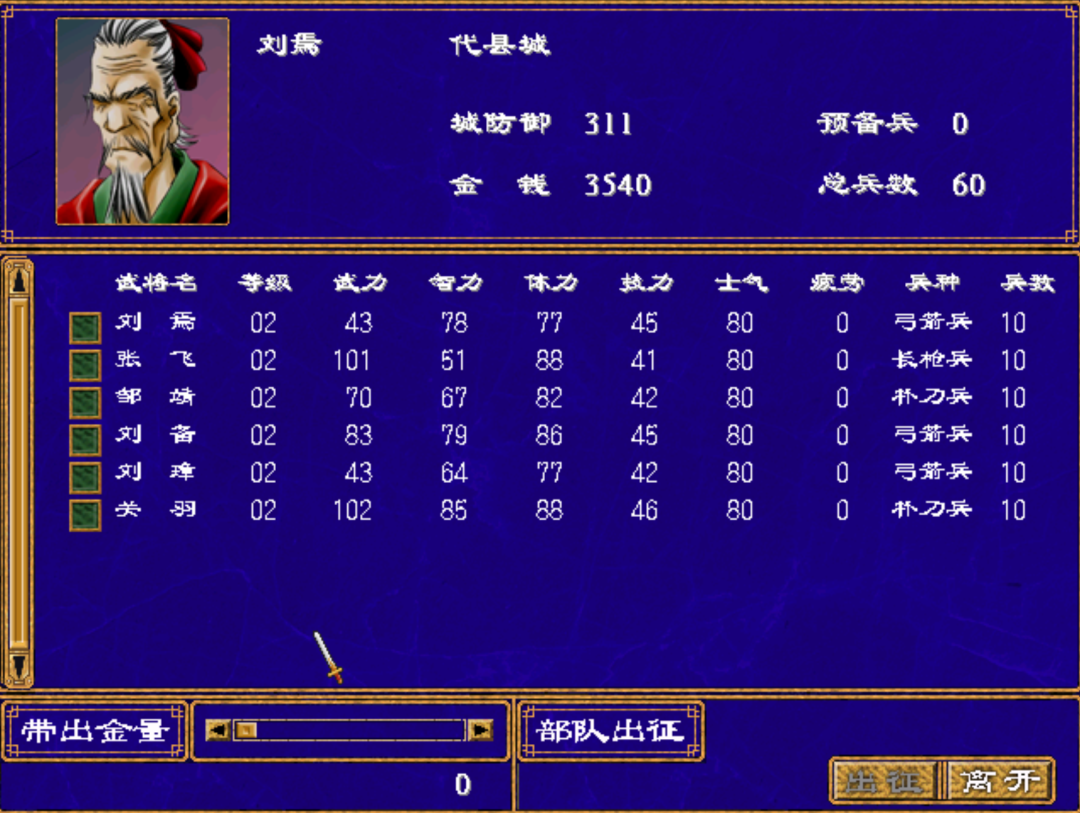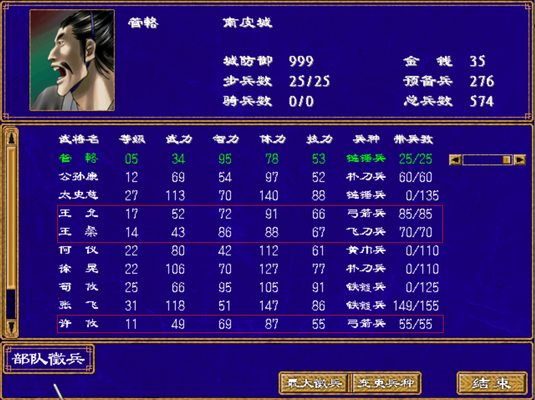 后来才知道,城市防御度直接影响着开战之后的城防和武将的表现,以及金钱的储存量,人物数量上限。而金钱则是用来买预备兵的,一百一个。