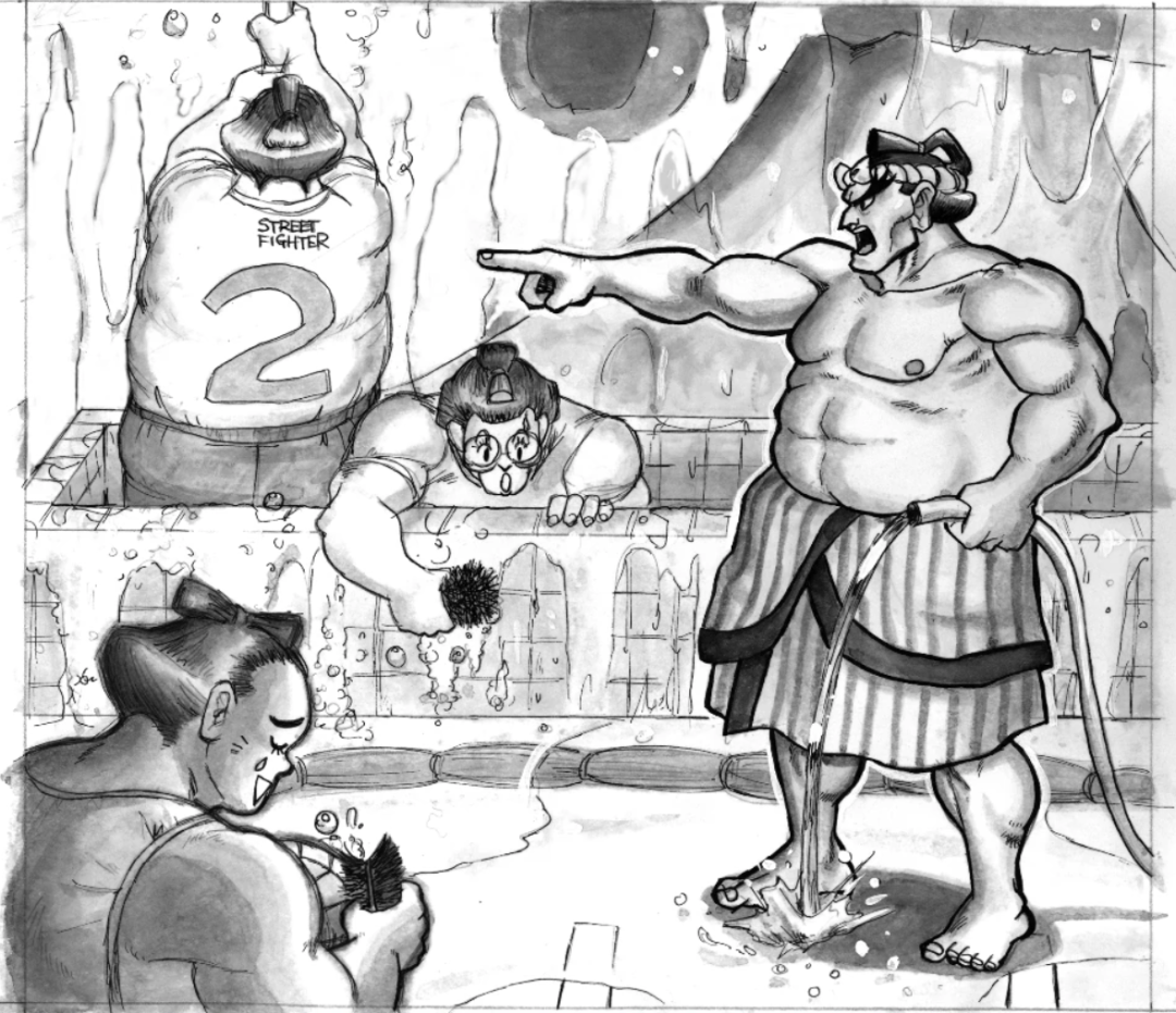 本田澡堂,在这里叫“加富根汤”(KAPUKON YU)。和我们熟悉的场景稍微有点不同,加入了镜子和水龙头。CAPCOM也想给玩家们一种复古的感觉,尽量不加入现代化元素。