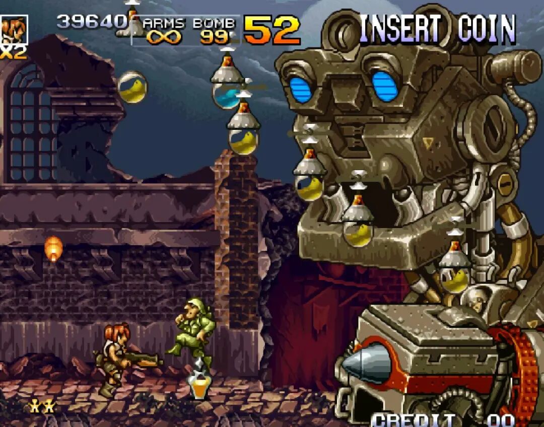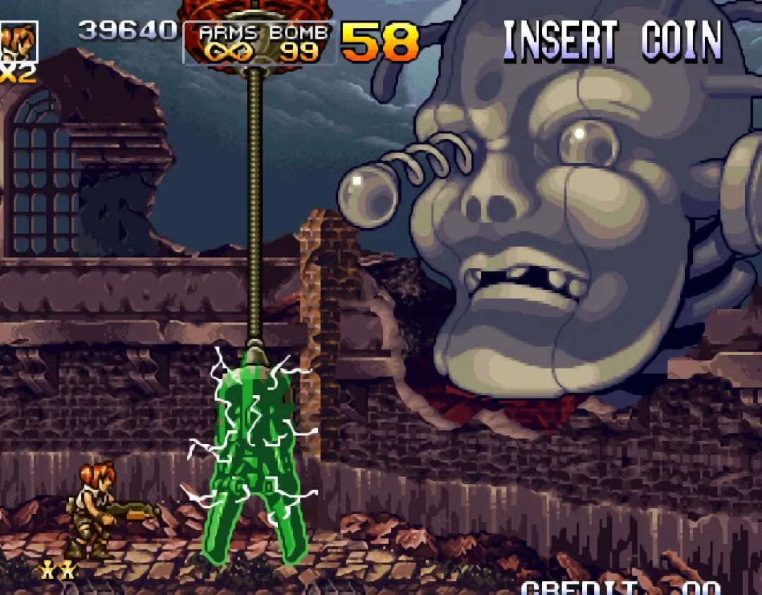 不怕大伙儿笑话,当年我头回玩《合金弹头4》时,一度卡死在第四关BOSS,当时只管攻击机器人大脑壳,也是在很久之后才知道打头没有用,必须先打上面的“爪子”才行。