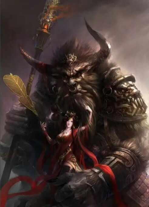 牛魔王与孙悟空,两人都会七十二变。牛魔王不敌猪八戒和孙悟空联手,终于现出原形,正是我们熟悉的牛神形象:只见其头如峻岭,眼若闪光,两只角似两座铁塔,牙排利刃。连头至尾,有千余丈长短,自蹄至背,有八百丈高下