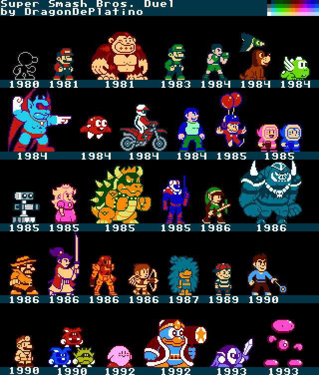 game&watch,大金刚,马里奥兄弟,拳无虚发,打鸦子,恶魔世界,接龙(cluclu大陆),越野机车,街头小子,打气球,爬雪山(敲冰块),机器人格罗,超级马里奥兄弟,塞尔达传说,武藏严流传,密特罗德(银河战士),光之神话,mother,马里奥医生,星之卡比,快乐机器人格斗