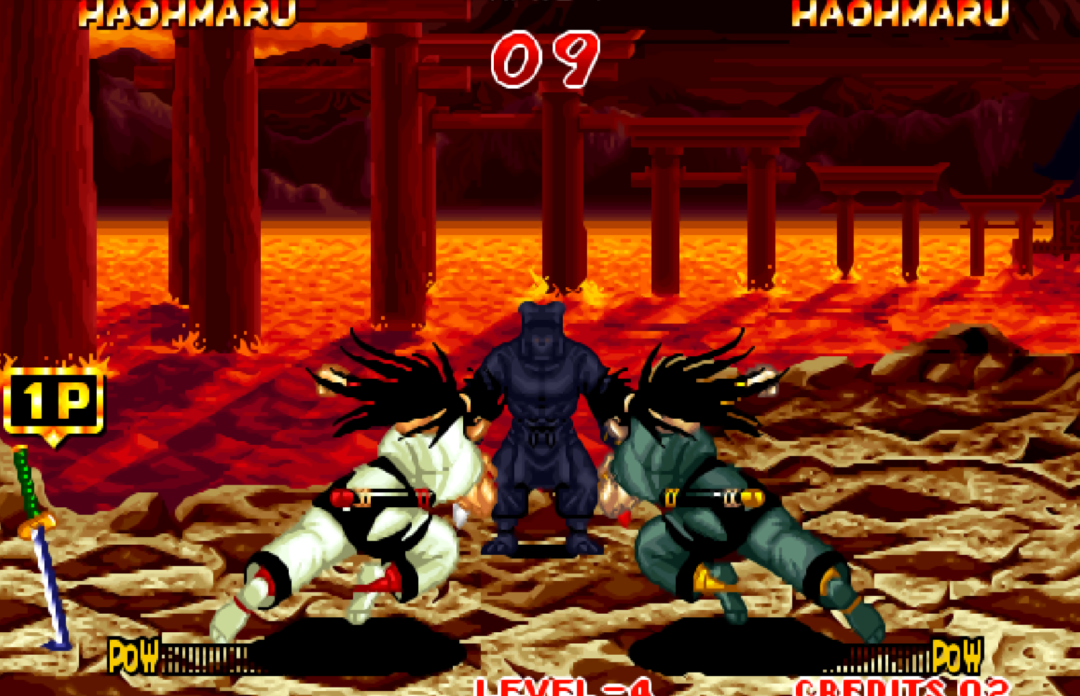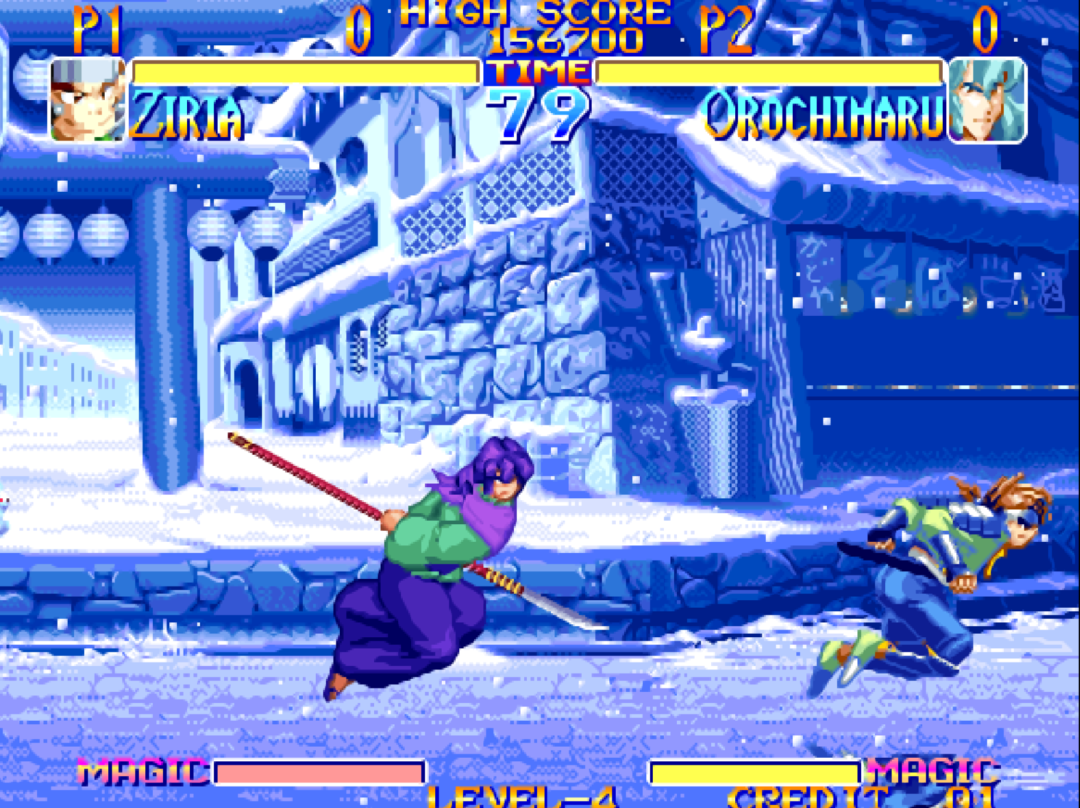 《真侍魂》中的“前前”也是冲刺。要是两个人一起按“前”的话就会进行拼刀。一个有武器,另一个没有武器冲刺的话,没有武器的可以抓住对手。