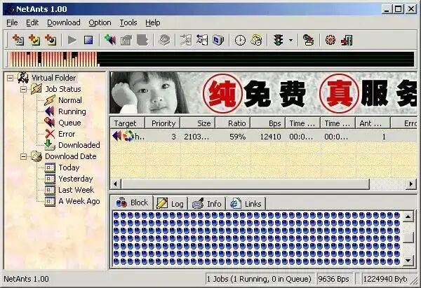 软件出现的时间比较早,记得当时下载的速度连100K都没有,好在那时候的软件个头都小,一般一天就能下载到了。不过后来支持网络蚂蚁下载的网站越来越少了,甚至很多时候都链接不上就放弃了。