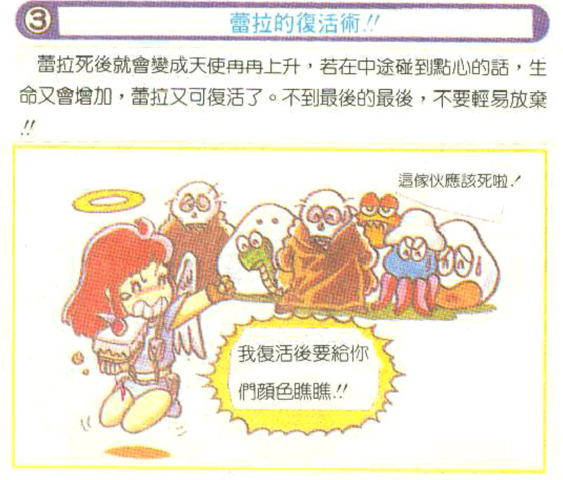 有意思的是,在蕾拉被打败之后会变成天使上升,但是要是在这期间碰到点心的话,当场就复活了。以前应该有玩家发现了吧!