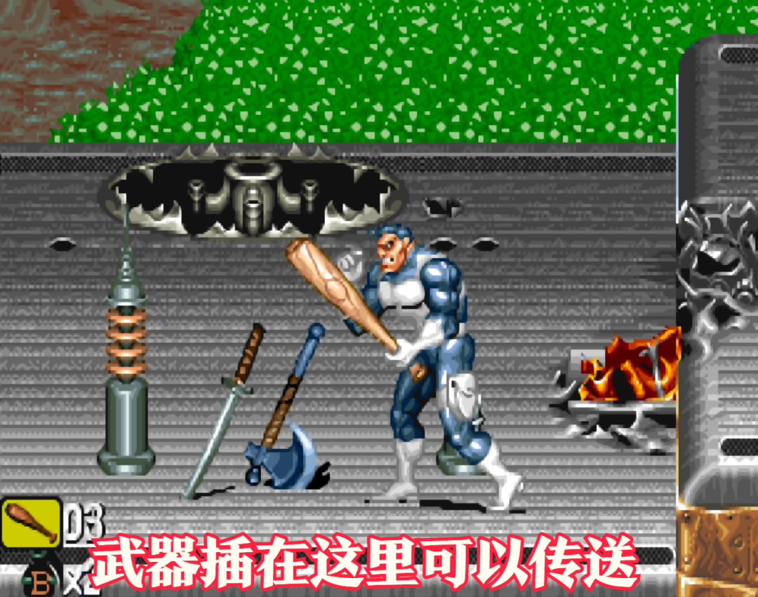 另外,不知道大家发现没有,在第四关倒数第二场景有个吊车钩,把钩子打坏将武器扔在吊车钩的中间。BOSS战开场的时候,这些武器就会从天而降。