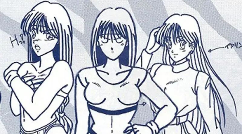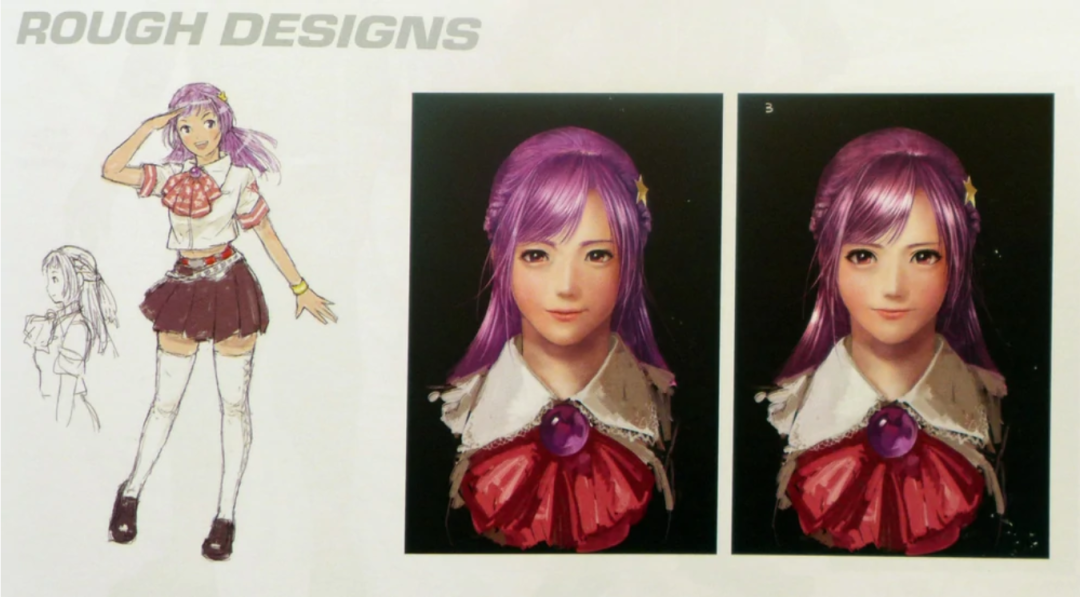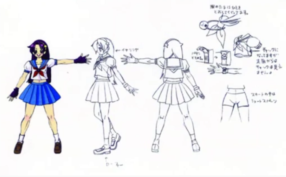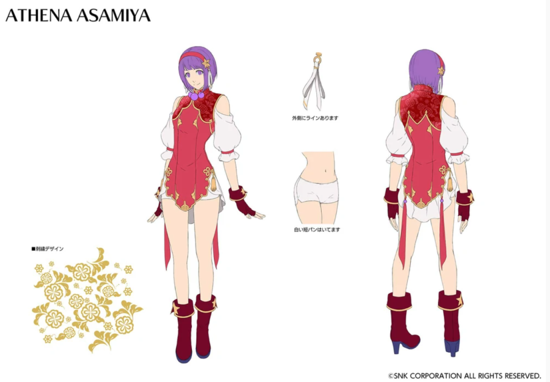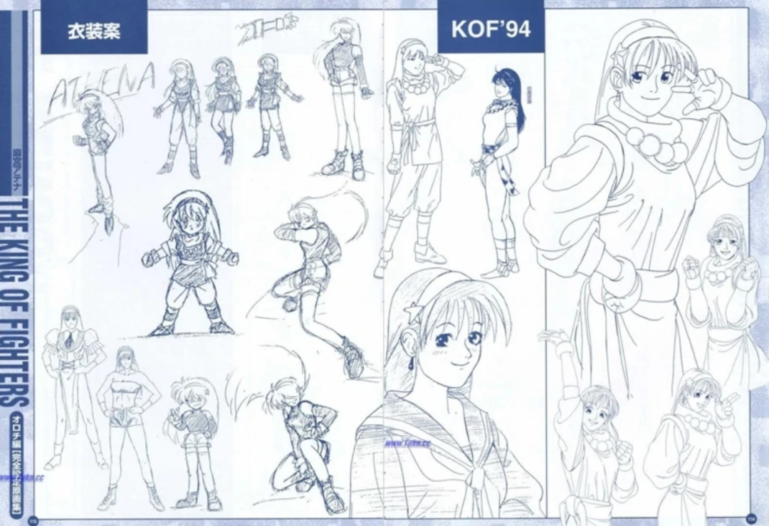 《拳皇94》的手稿中我们可以看出,最初的雅典娜并非是穿着武术服装的打女,而是一位时尚女孩,甚至还有类似不知火舞的造型。不过最终还是敲定走青春靓丽的清纯路线。