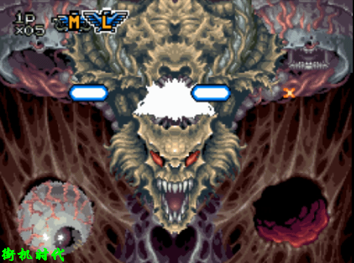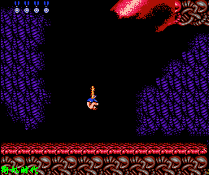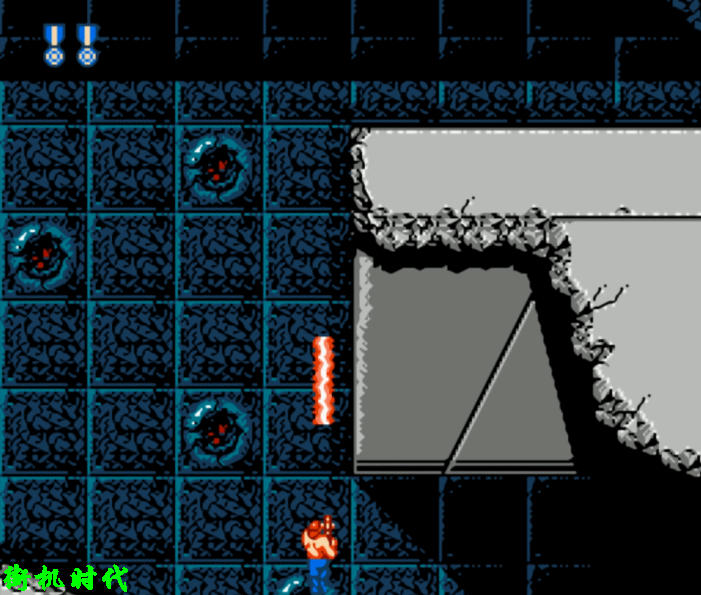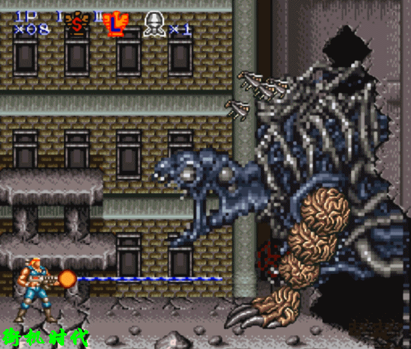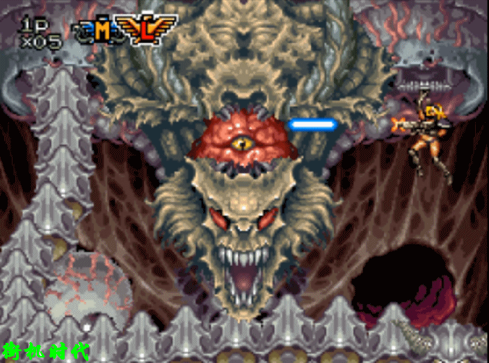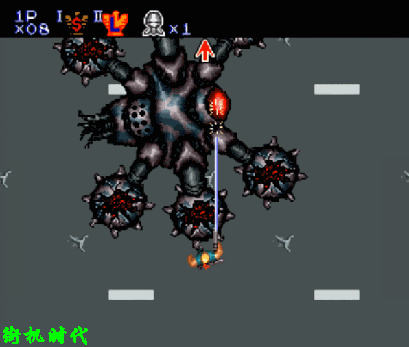 《魂斗罗3》基本上还原了前两代激光的形态。在纵版关卡中,激光的价值才真正发挥出来。二关BOSS场景,L弹是最实用的。