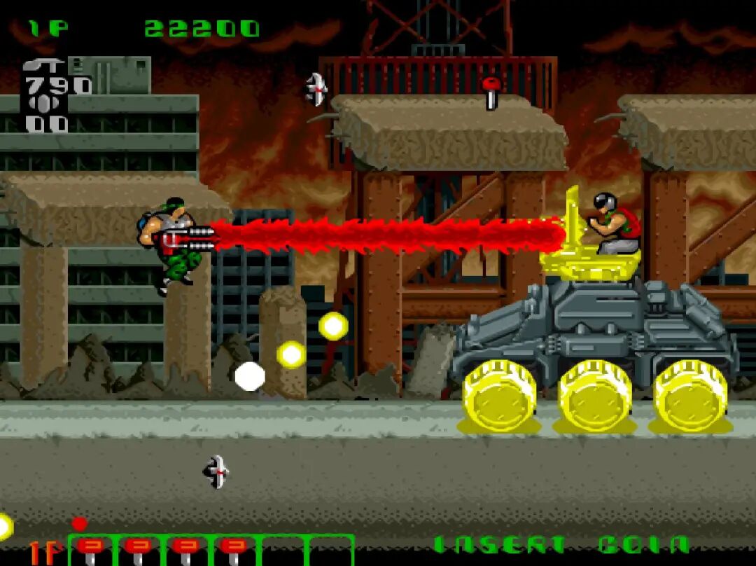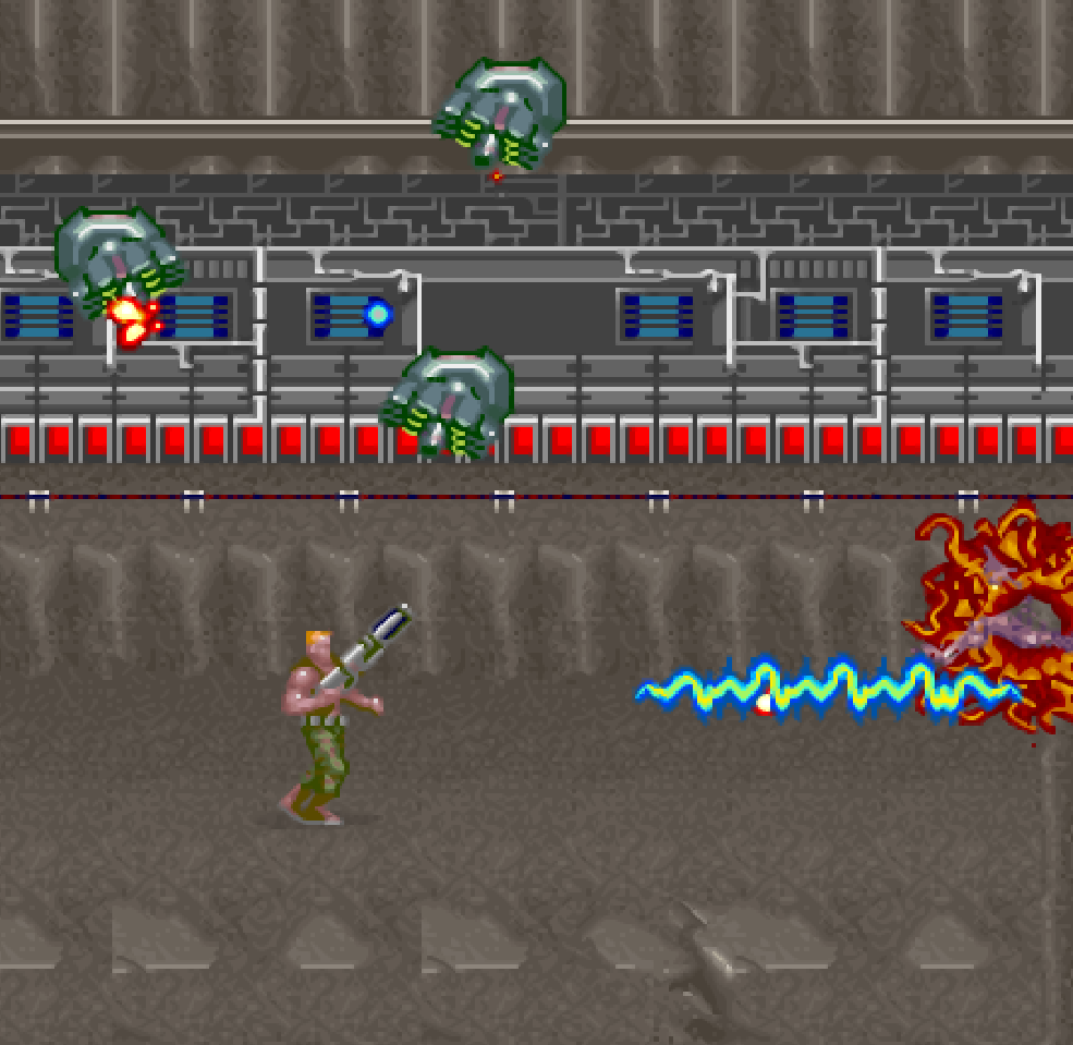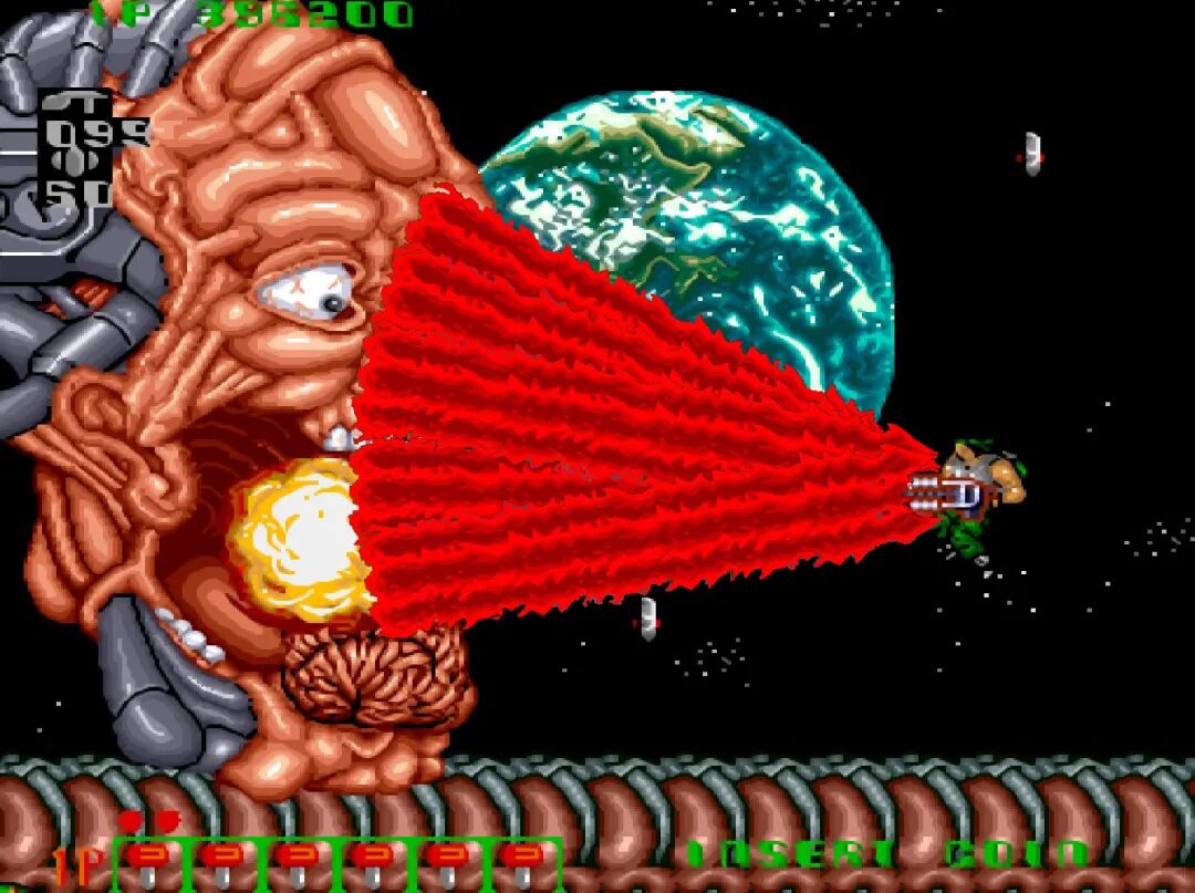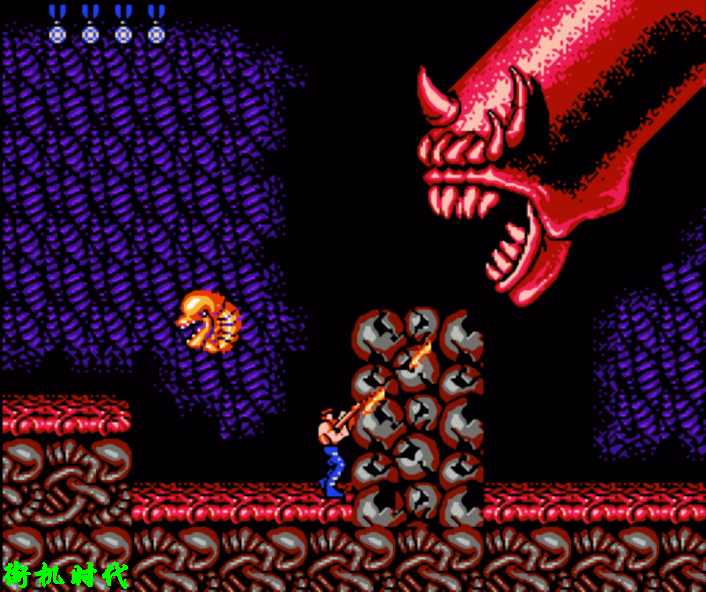 也是在很多年之后才知道,原来这并不是激光,而是火焰枪。只不过游戏中呈现出来的方式比较特殊而已。在吃到加大火力的道具之后,打出来的激光是三股,威力极大。BOSS都支撑不了几秒。