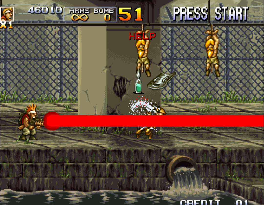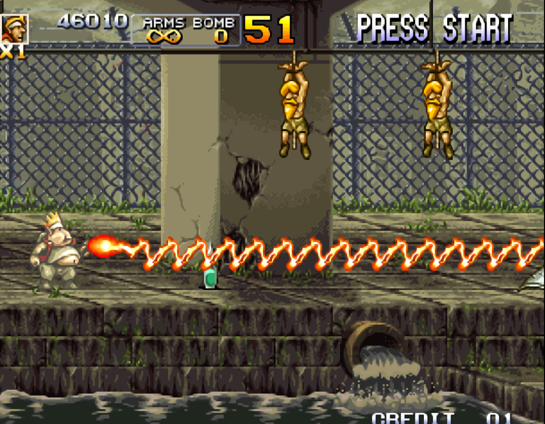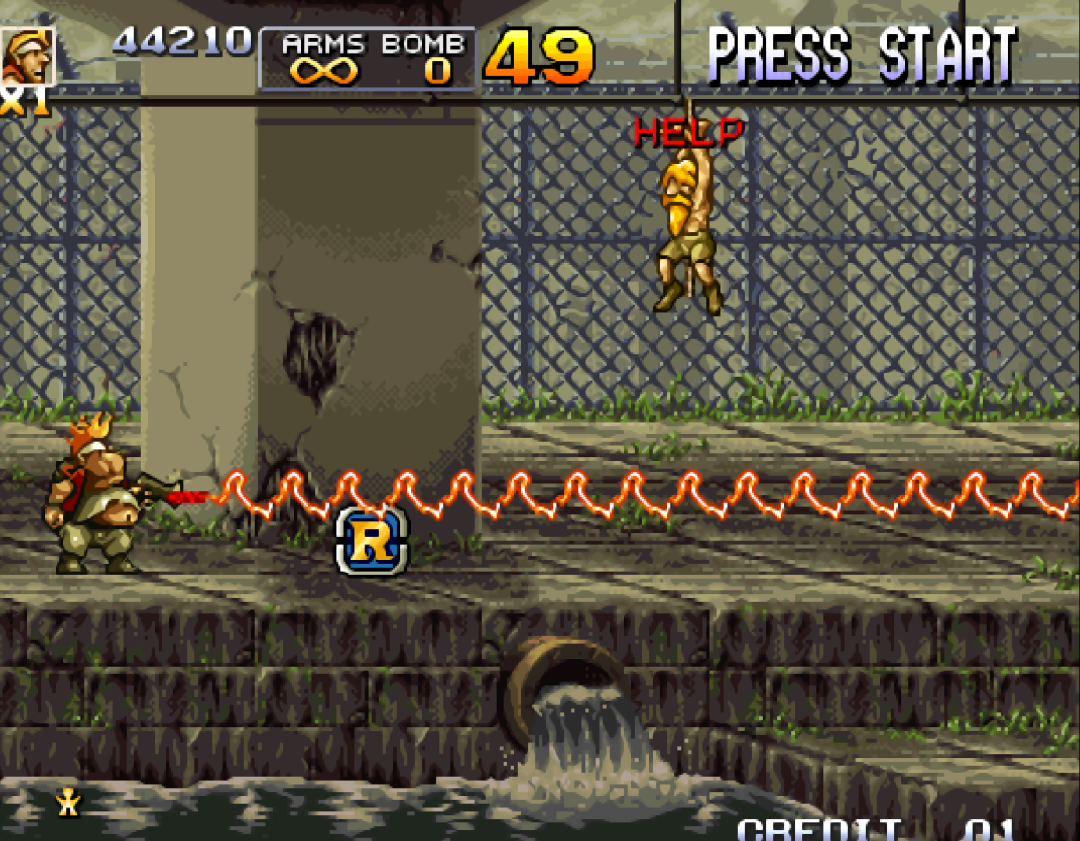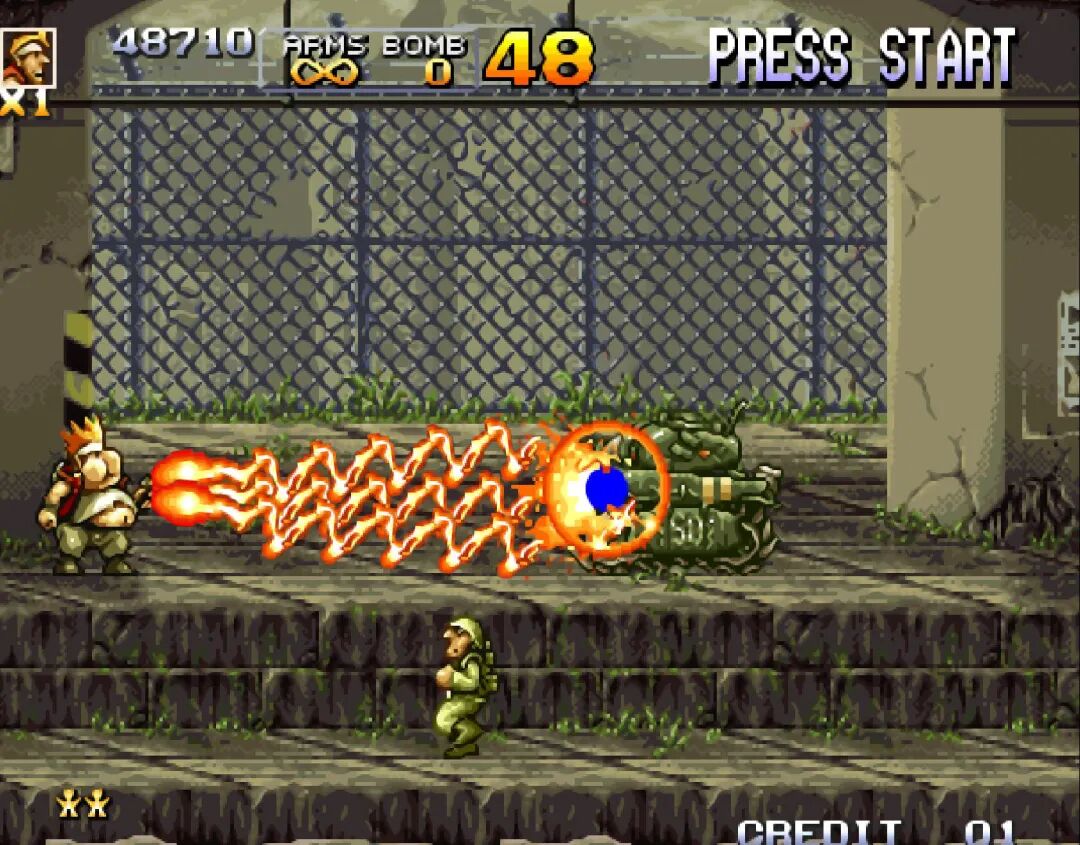 变胖之后吃到的大L,堪称是《合金弹头》系列最具代表意义的武器。特效让其他的武器黯然失色。一直到《合金弹头7》出现了T弹,才终于有了可以超越的武器。