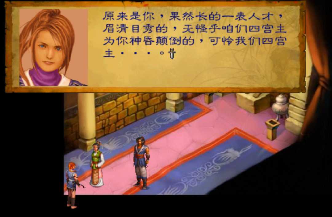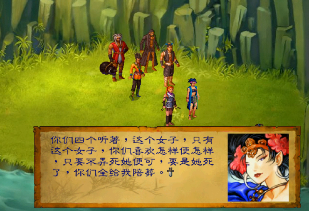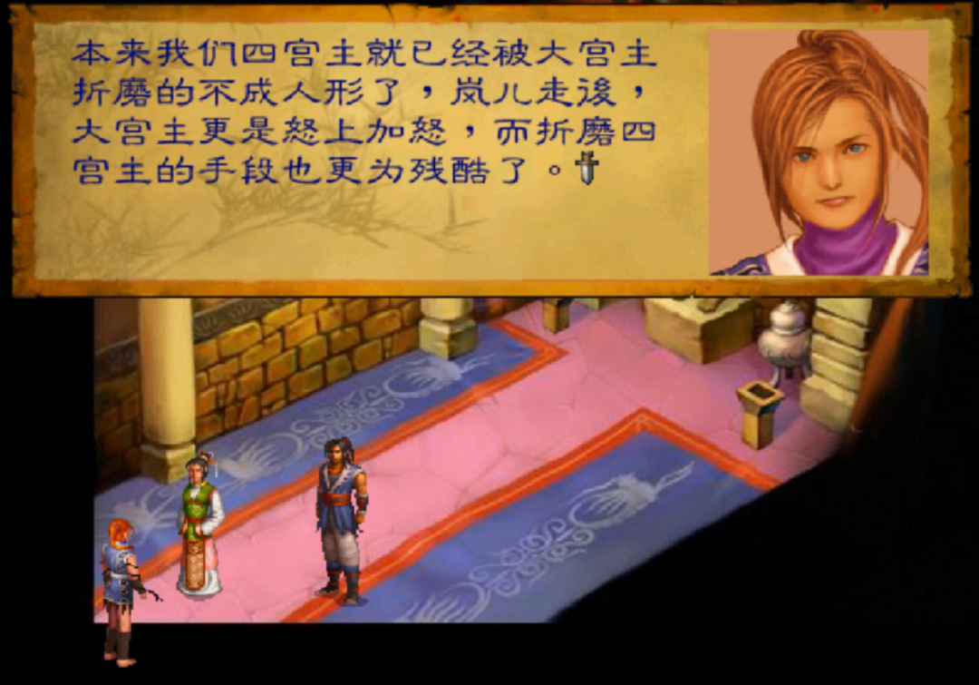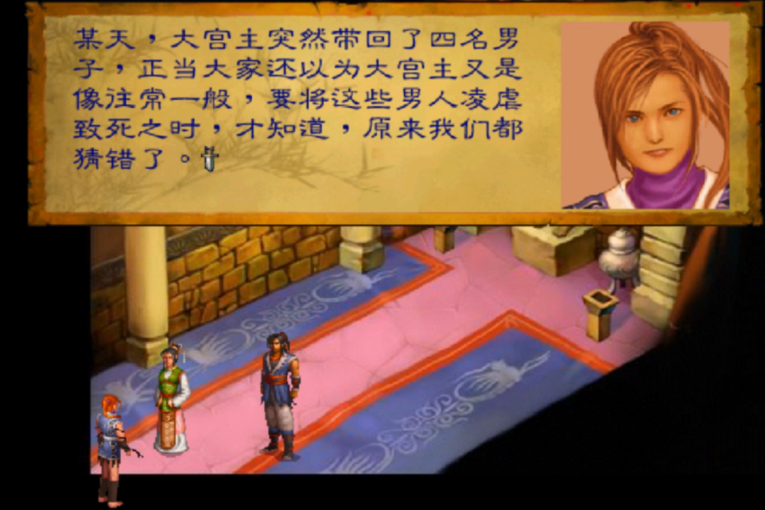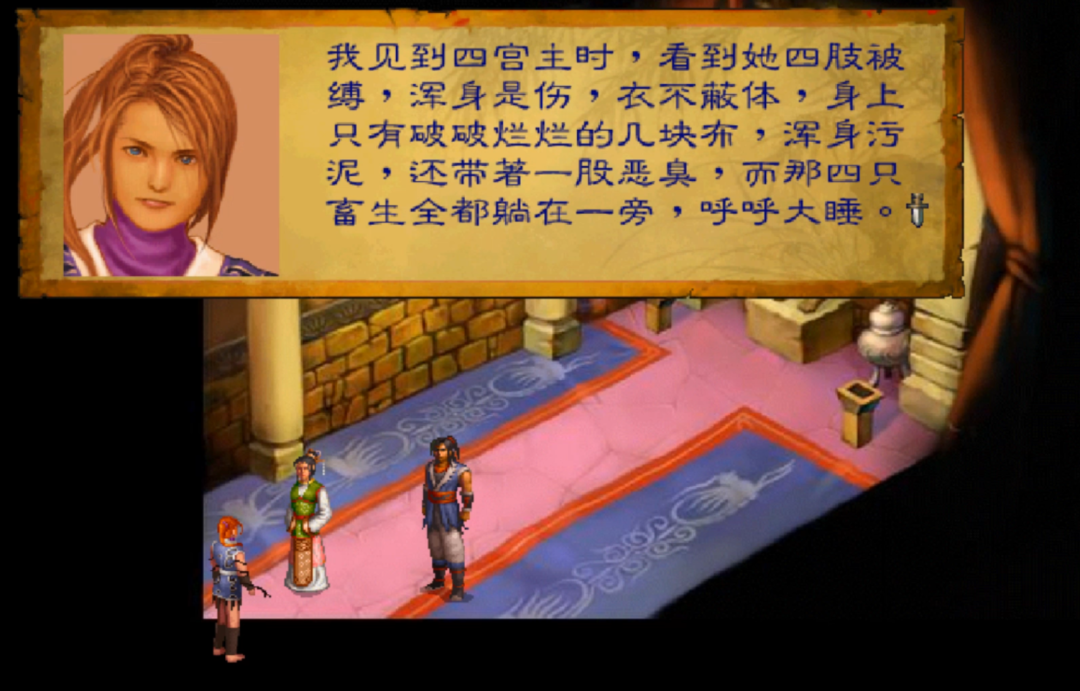 枫描述的场景中,大宫主对“吃喝嫖赌”四大恶人(就是之前史燕剧情中的四个家伙)说:这个女子,你们喜欢怎样就怎样,只要不弄死她便可。