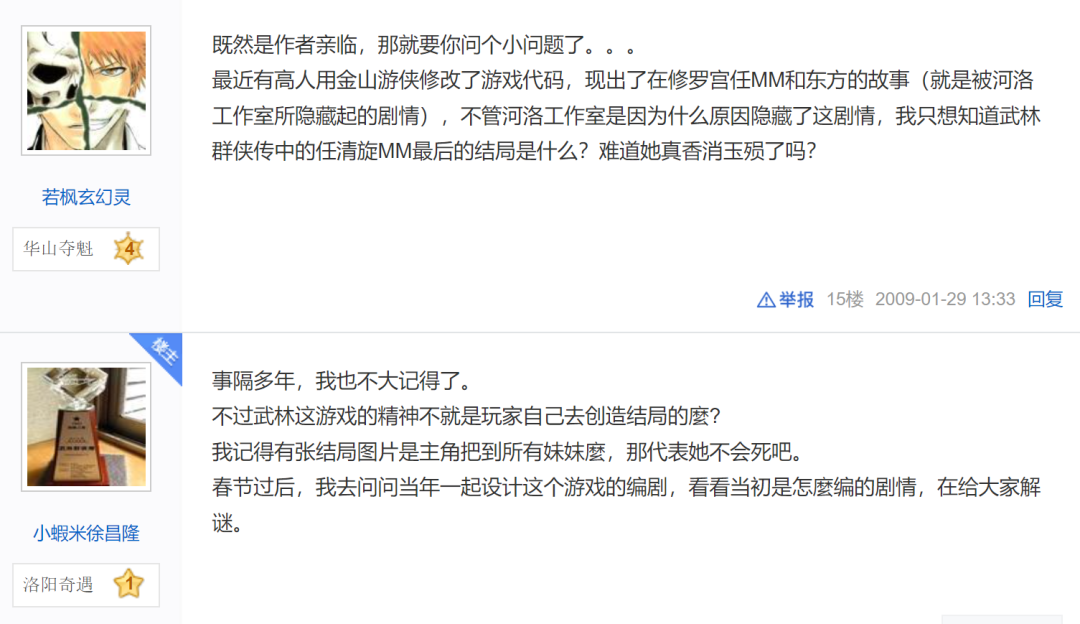 多年前在贴吧中曾经出现了一位网友,自称是徐昌隆(武林群侠传导演和编剧)。绝大部分玩家都表示相信。在这期间就有不少人向徐昌隆表示对这段剧情很疑惑。而徐昌隆则说时间已经太久,有些记不得了,不过他表示任清璇不会死的。