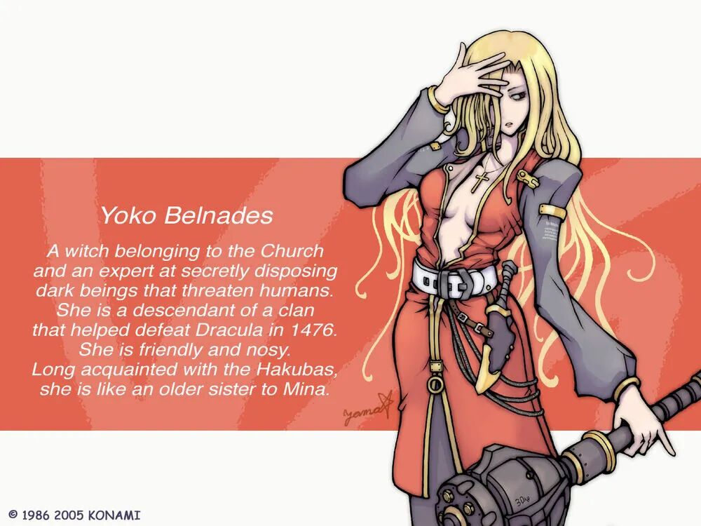 在《恶魔城:晓月圆舞曲》和《恶魔城:苍月十字架》洋子小姐都是非常重要的人物,虽然她不直接参与战斗(苍月可用),但是每一次的出现都会给剧情带来全新的进展。