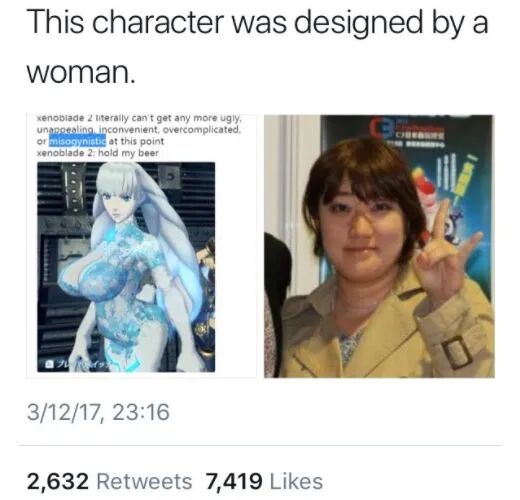 2017年Nintendo Switch主机发售的《异度神剑2》,同样是因为TSUKI有着非常大的欧派,然后就有女拳专门在推特发文表示这款游戏有污化女性的嫌疑,夸张的欧派是专门用来取悦男性。