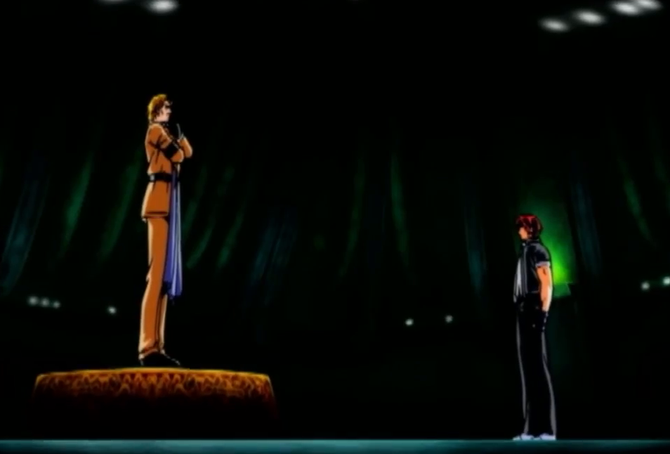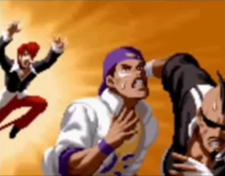 《拳皇95》时期,八神庵为了参赛随意找到了两个落单的人,比利和如月影二 参加大赛。但是刚刚组成的队伍是无法收到邀请函的,三人一合计直接抢走了美国队的邀请函。