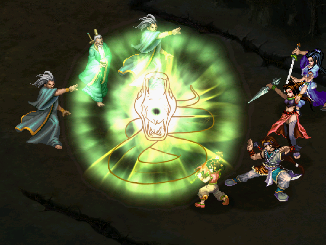 没错,只要BOSS和主角都没死,那合体技能就可以一直累积伤害,使用的次数越多伤害越高。遗憾的是,在后期版本中,这个伤害无法累积到下一个场景,要不然的话比《仙剑奇侠传1》中的梦蛇还猛。