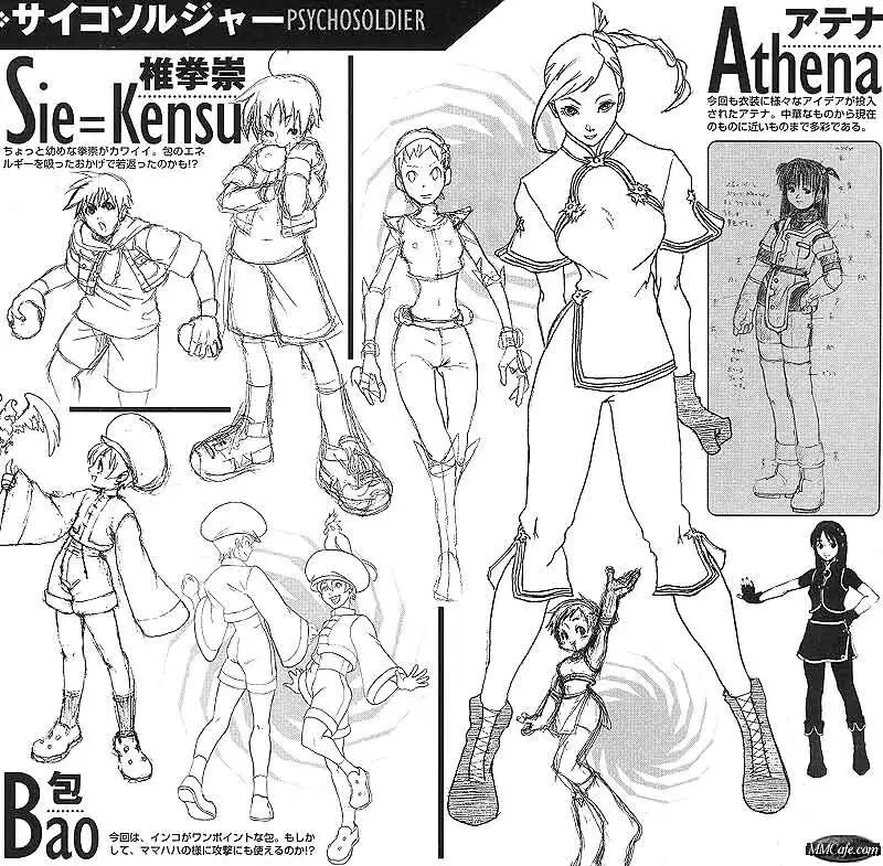 麻宫雅典娜最初登场的作品是《超能力战士》,画风还属于比较可爱的类型。来到《拳皇》系列之后,就以森高千里为原型开始走青春路线了