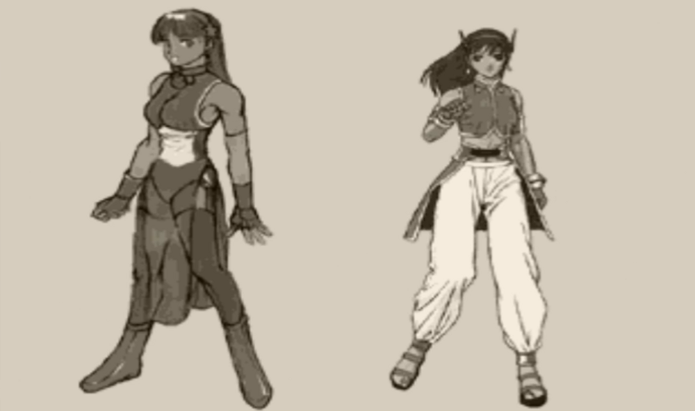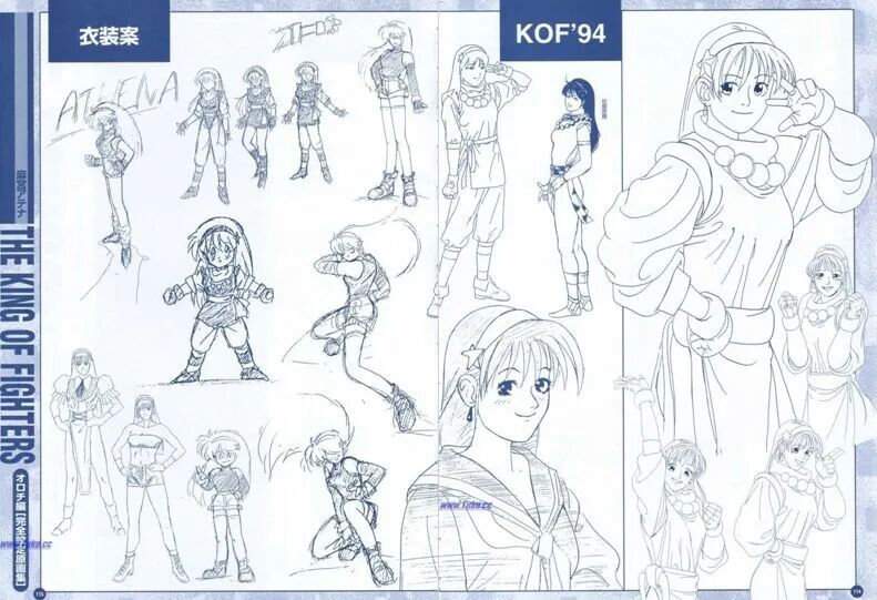 《拳皇94》时期我们见到的雅典娜穿着的是中国功夫服装。而在原稿中我们则可以看到她穿旗袍、短裤的形象。