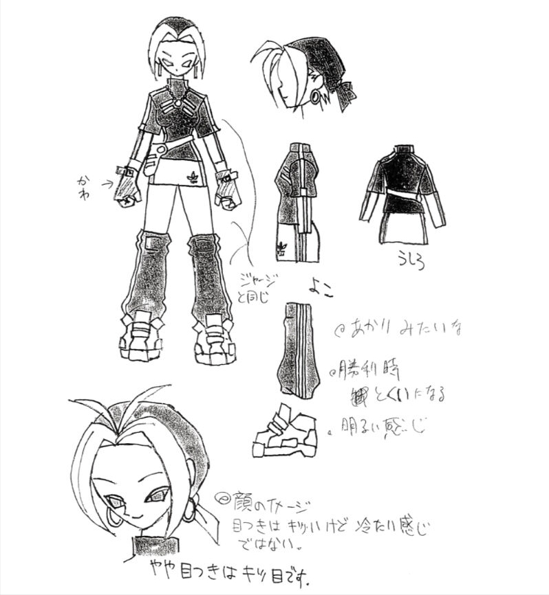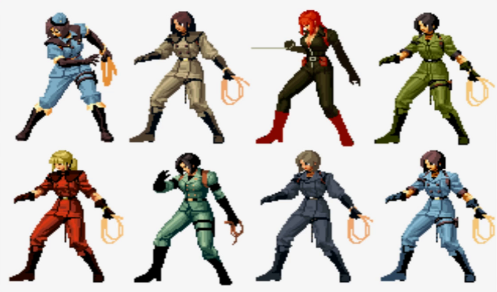这个角色其实在《拳皇97》时期就已经出来设定稿,是游戏中第一个使用鞭子的人物,但当时一直没有机会加入到游戏之中。