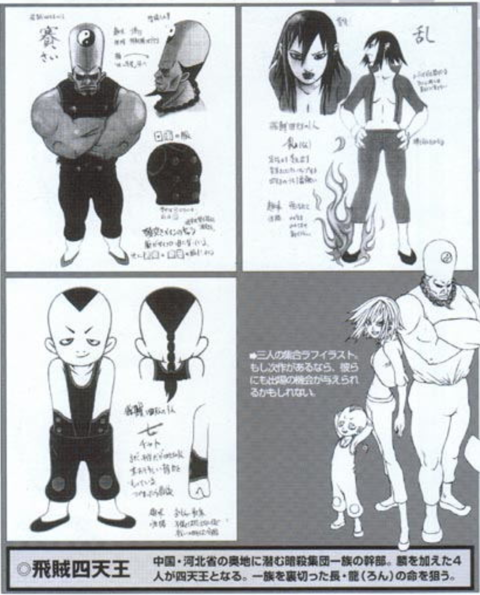 飞贼四天王,当年还是经过大量投票才被选用的人物。但是在《拳皇2001》中只能作为背板墙。主要是为了衬托出麟和堕珑并不是独自在战斗,背后还有一个强大的飞贼集团。