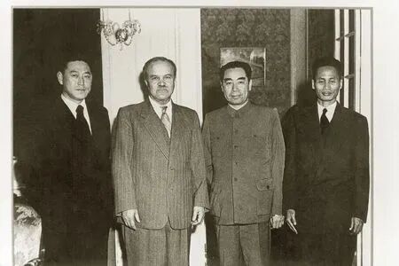 在1954年的日内瓦会议上,中国、苏联、美国等大国共同商讨如何解决和平朝鲜战争等问题,兼任中国外交部部长的周总理参与会议。
