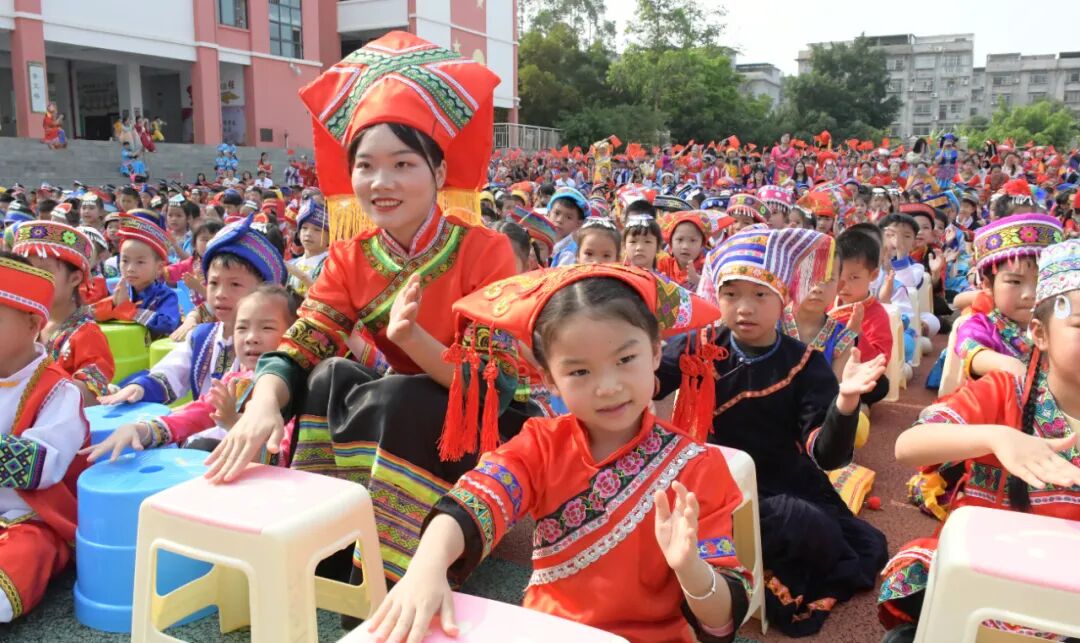 “石榴花开心连心,民族团结一家亲。”在中越边境的广西崇左,广西民族师范学院附属第二小学的各族少先队员们身着绚丽的节日盛装,在“喜迎二十大,争做好队员”主题实践活动中唱着脍炙人口的壮乡山歌、跳着“最炫民族风”的壮族“蚂拐舞”、抛着五彩缤纷的壮锦绣球。